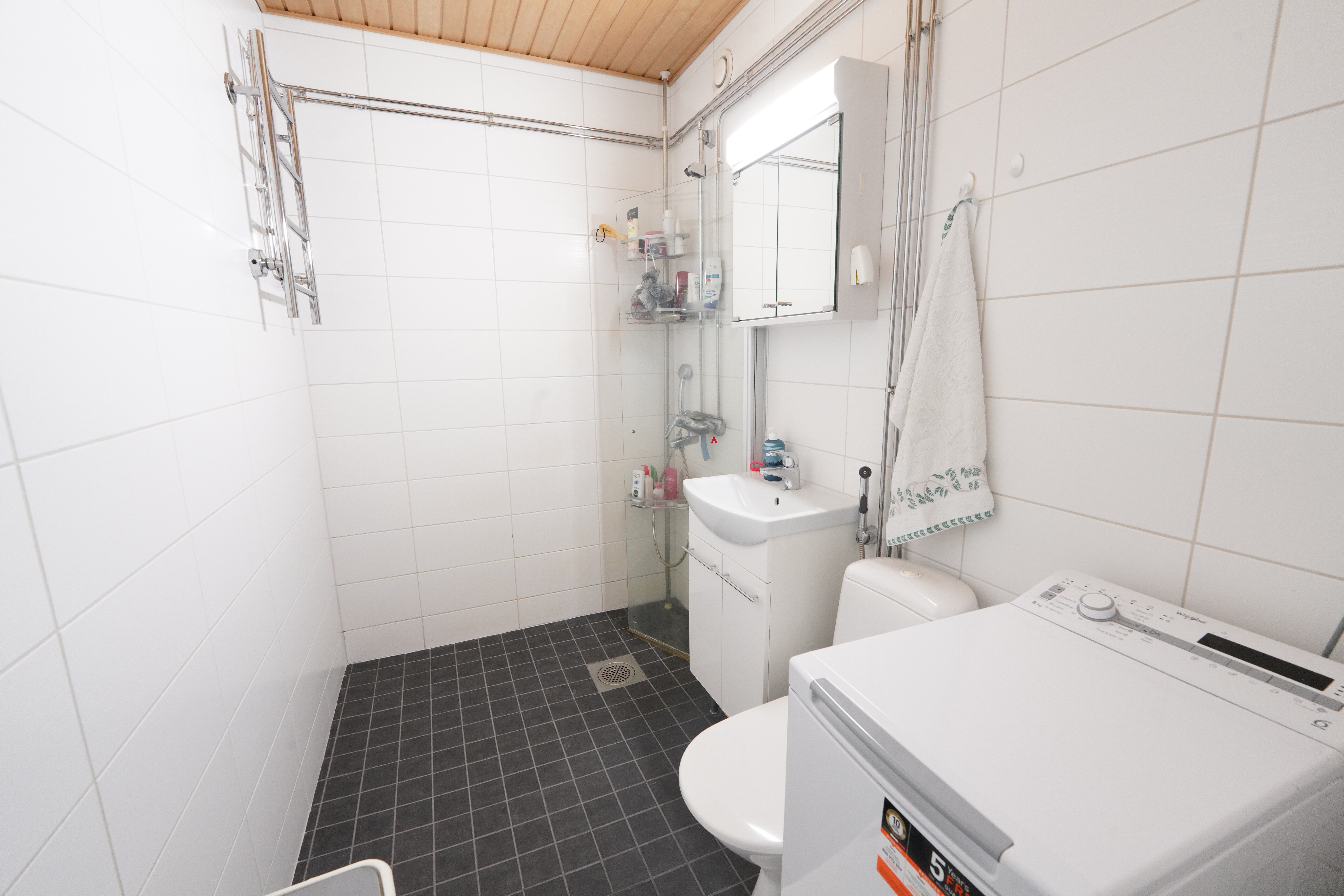 Varusteet: suihku, peilikaappi, lattialämmitys, pesukoneliitäntä