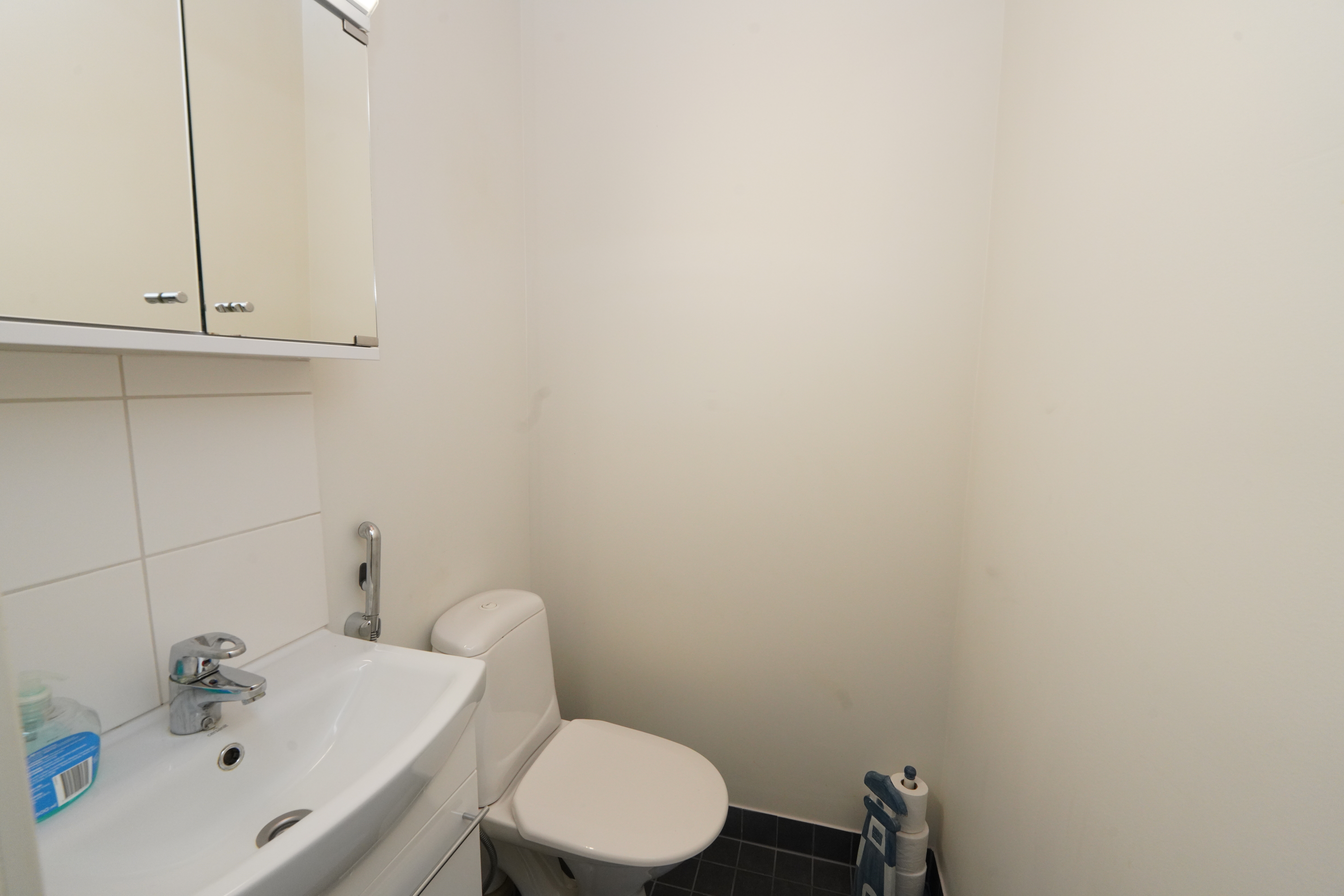 Varusteet: lattiaan asennettu WC, bidee, peilikaappi