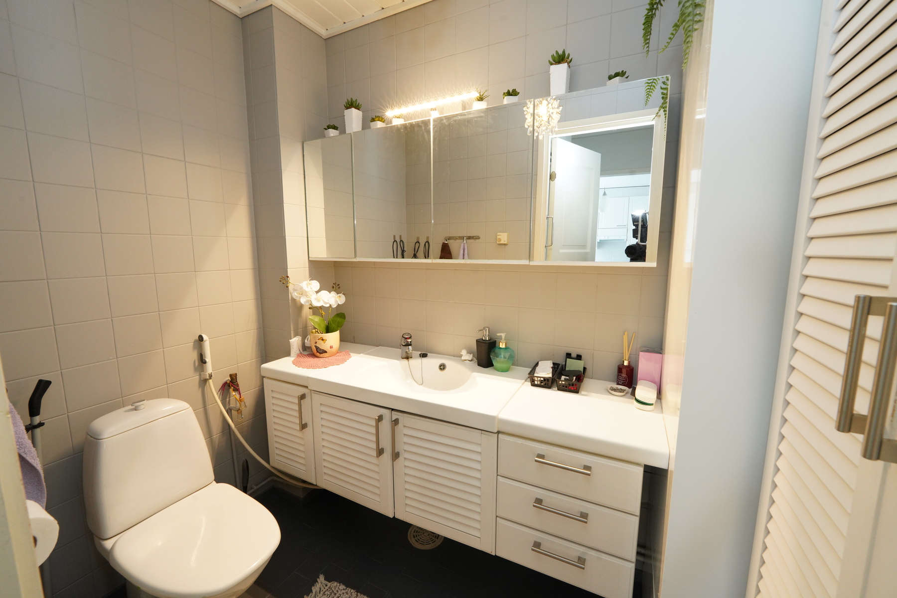 Varusteet: lattiaan asennettu WC, bidee, peilikaappi, allaskaappi