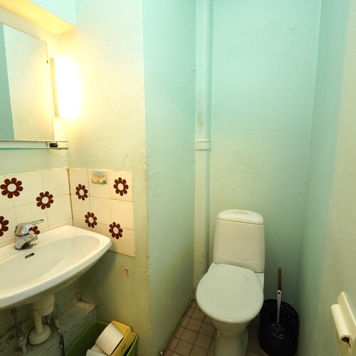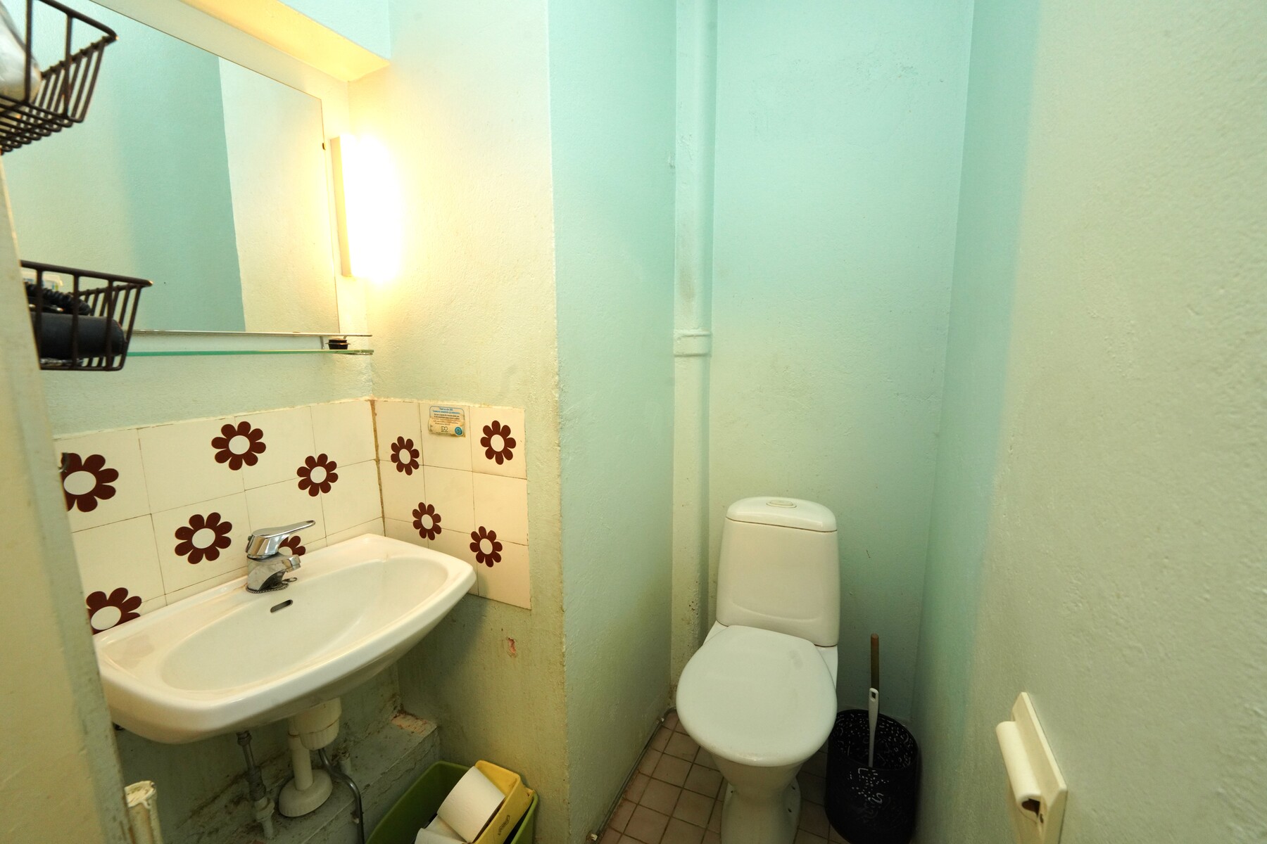 Varusteet: lattiaan asennettu WC, peili