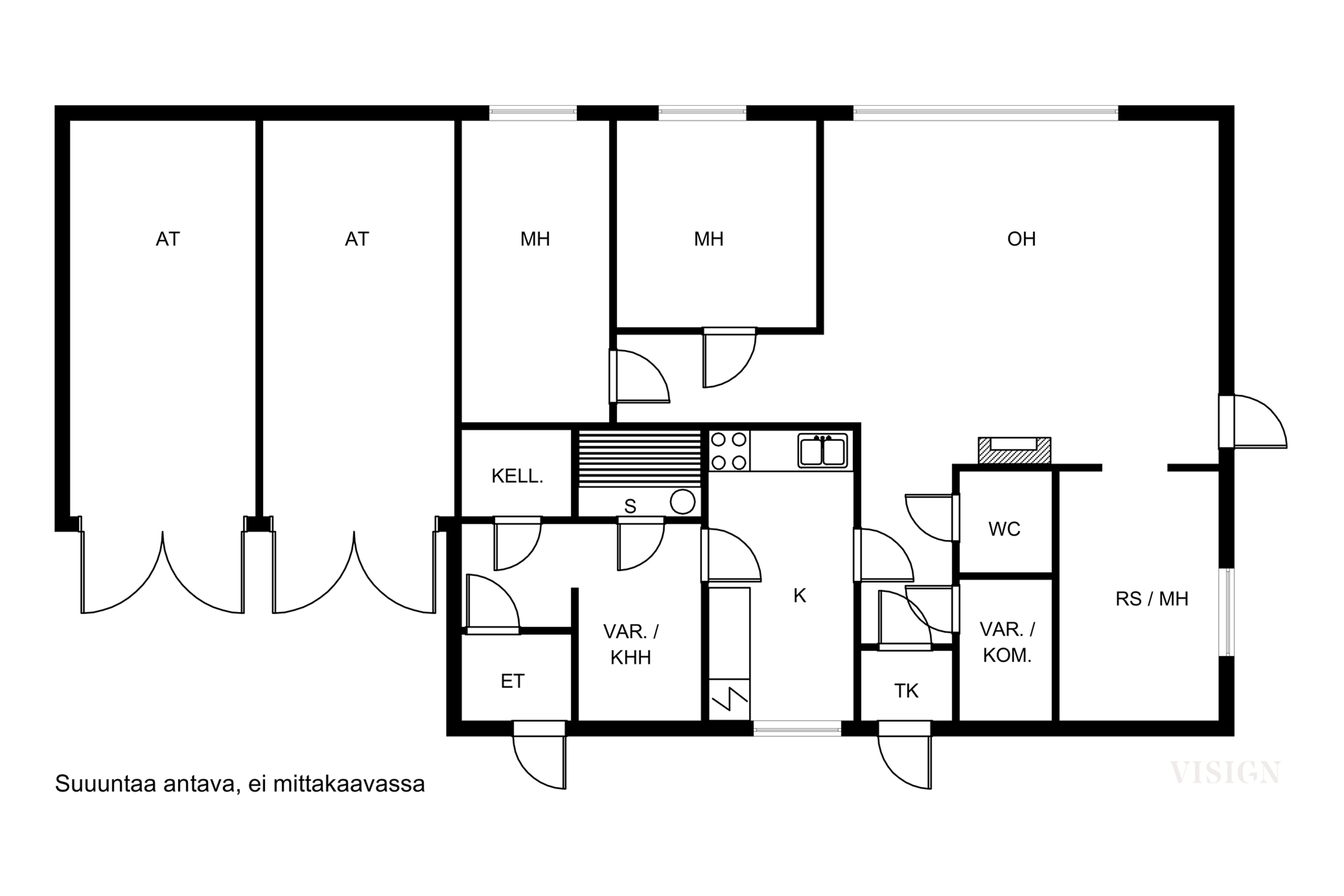 Kaksi varsinaista makuuhuonetta, kolmatta käytetty olohuoneen viereisenä ruokasalina.