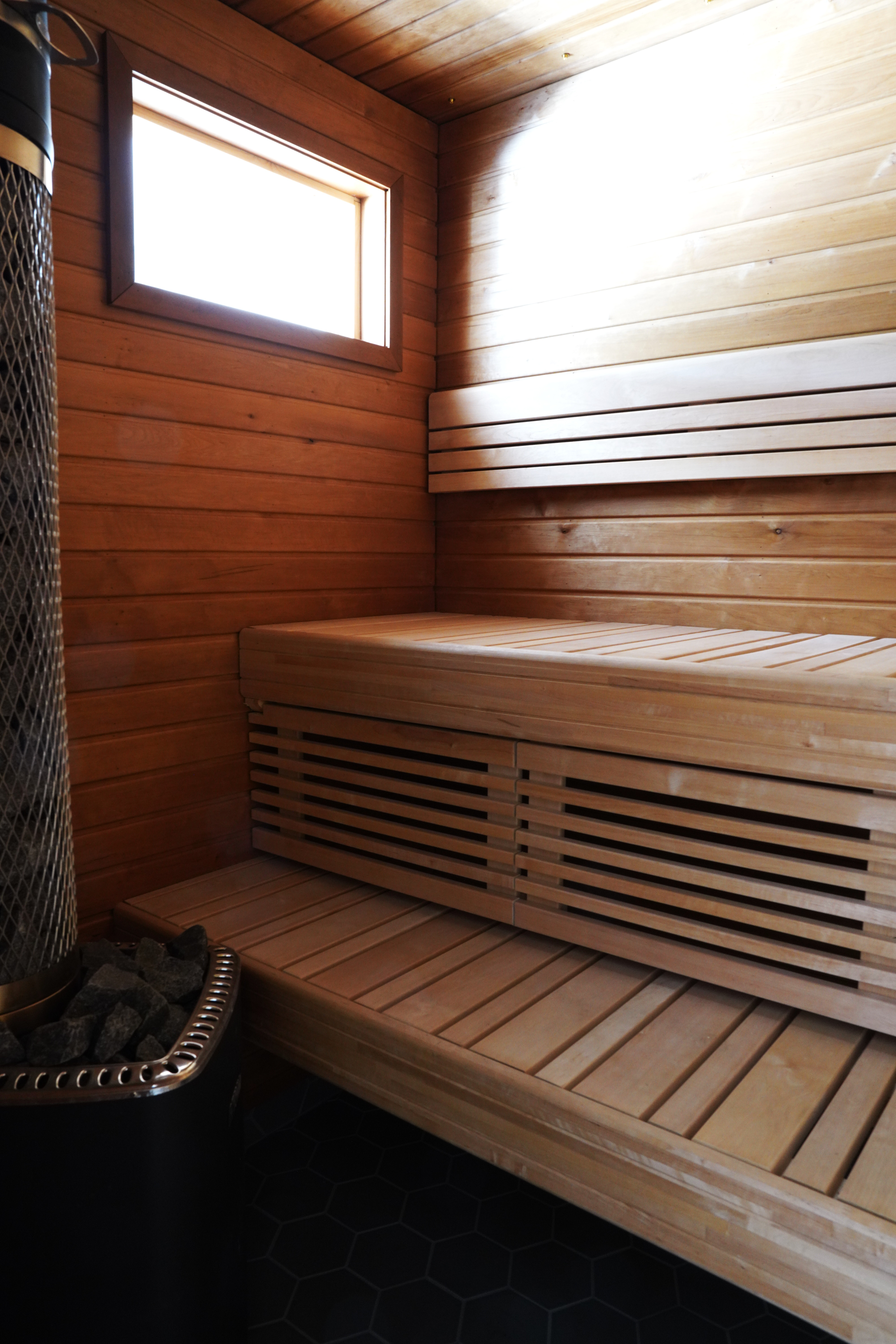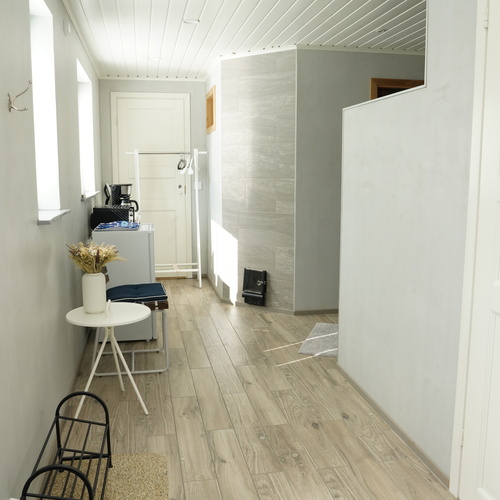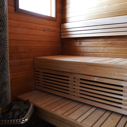 Sivurakennuksessa; lauteet tervaleppä, kiukaan luukku sekä saunan että oleskelutilan puolella