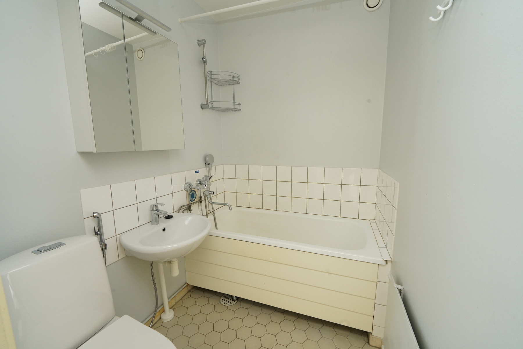 Varusteet: suihku, peilikaappi, kylpyamme