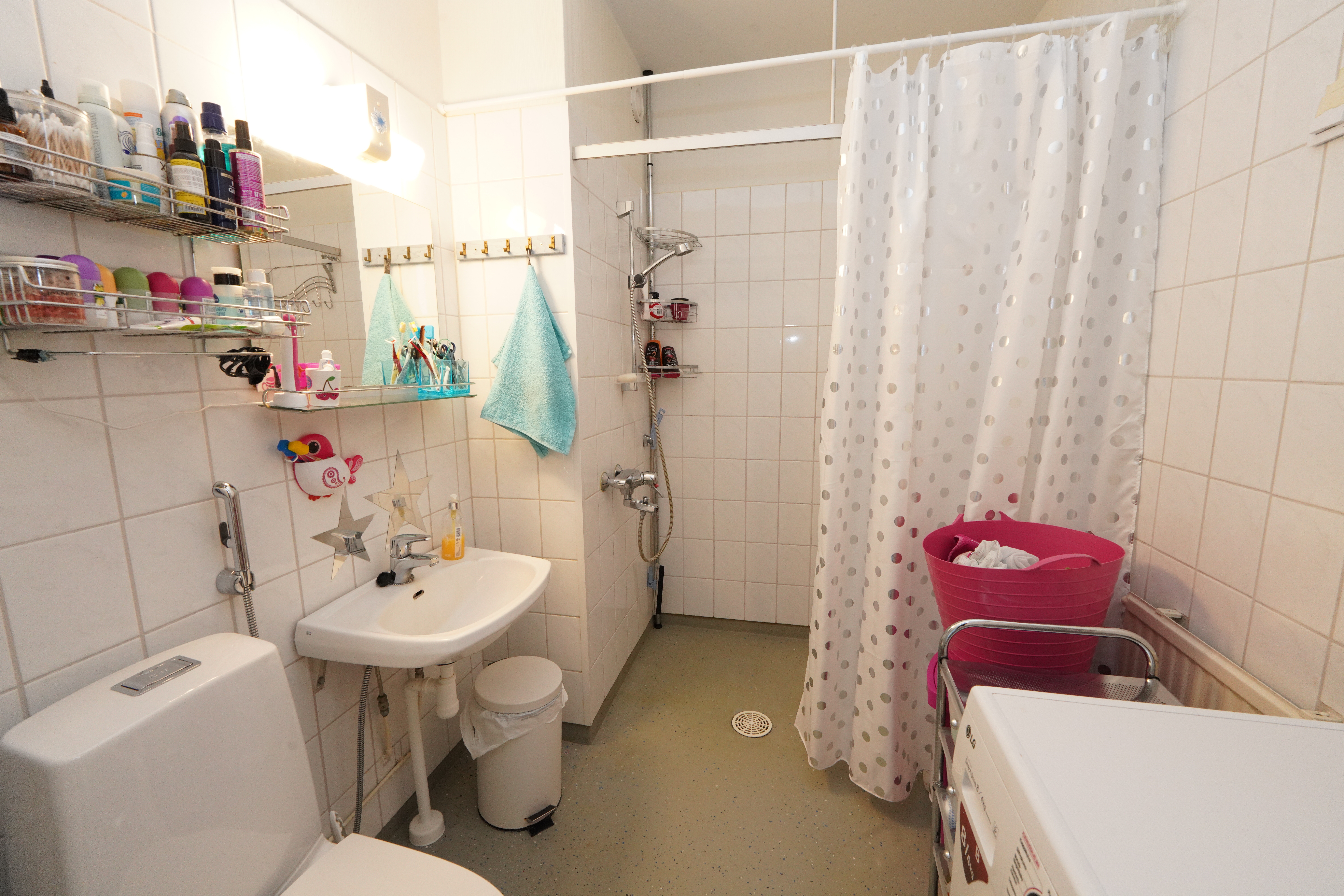 Varusteet: pesukoneliitäntä, suihku, peili