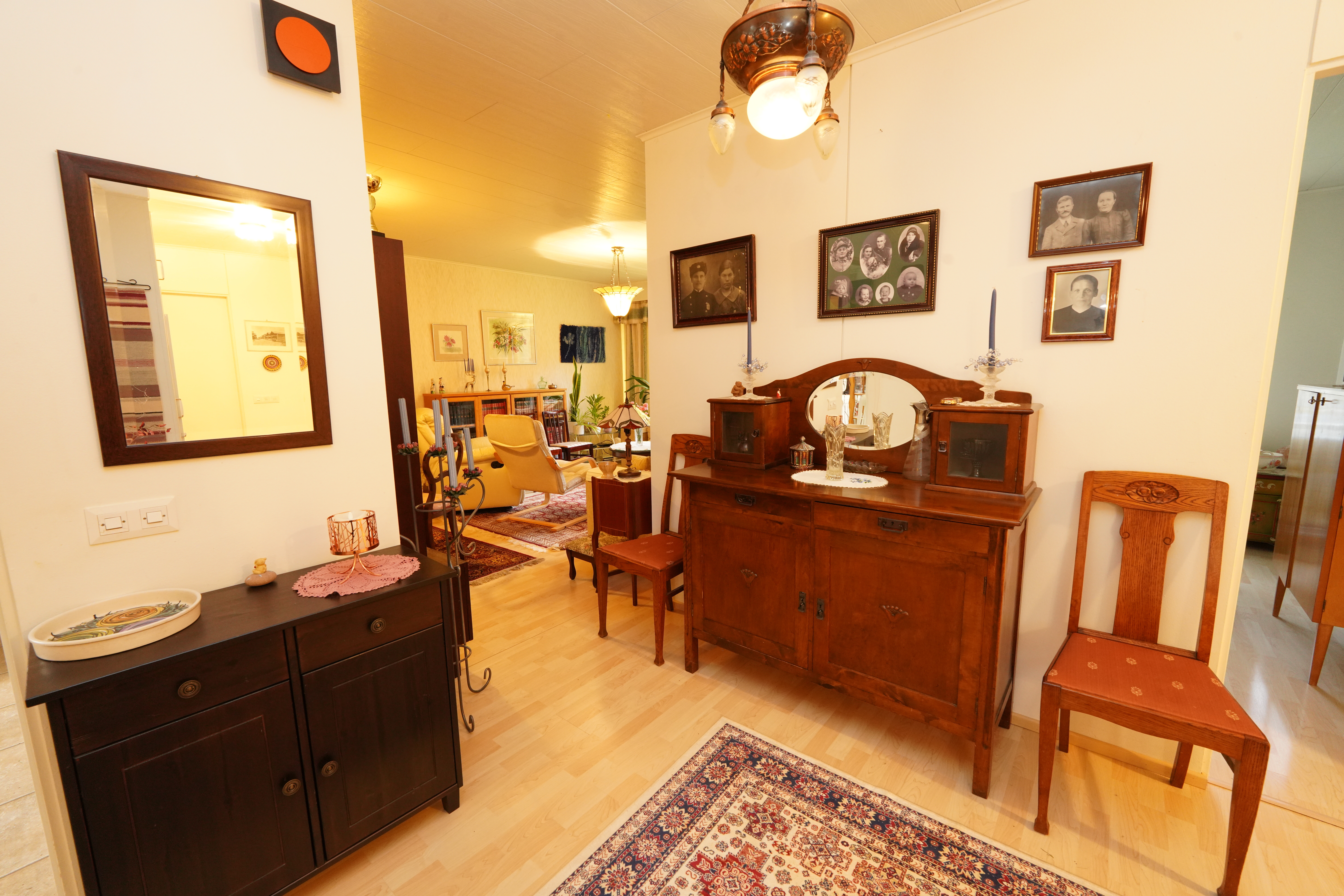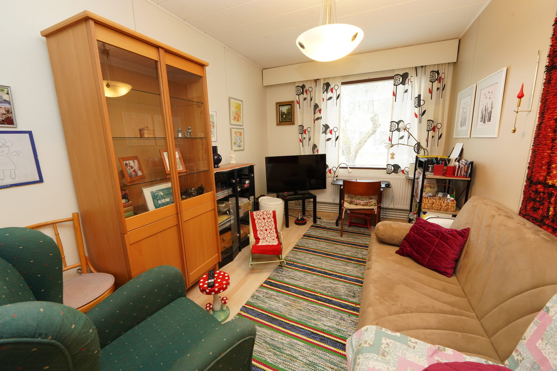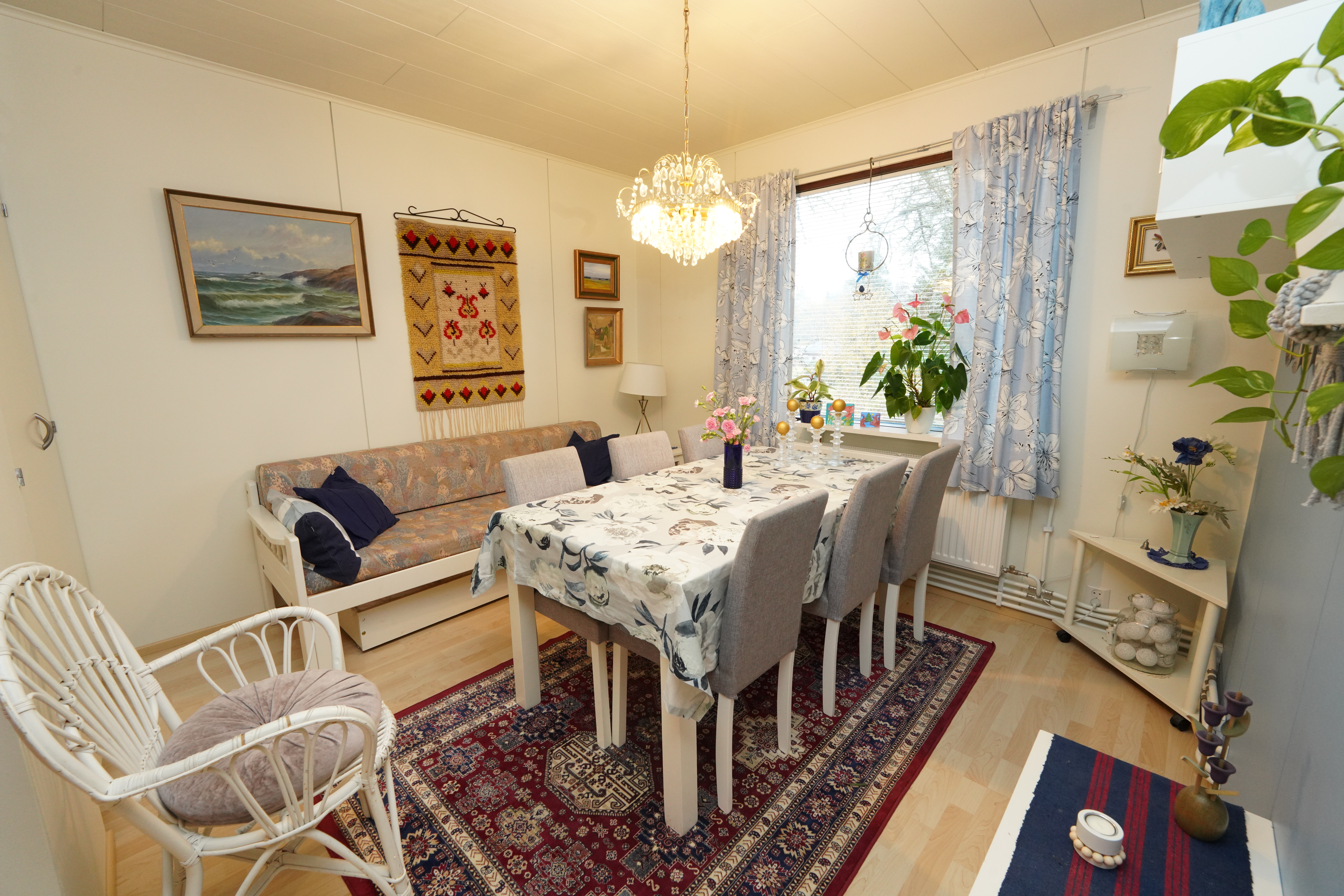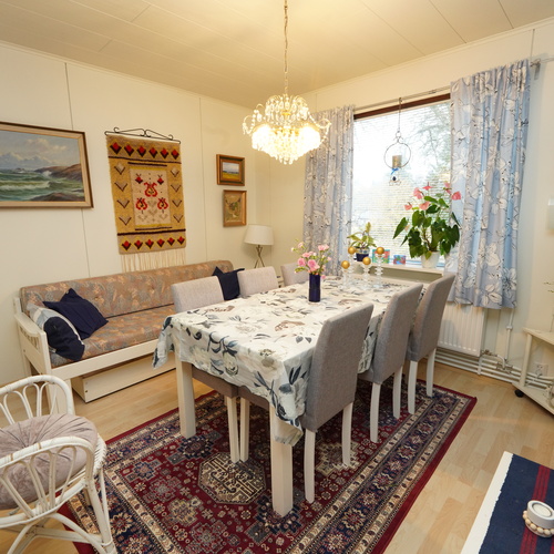 Yksi makuuhuoneista on muutettu avoimeksi ruokailutilaksi.