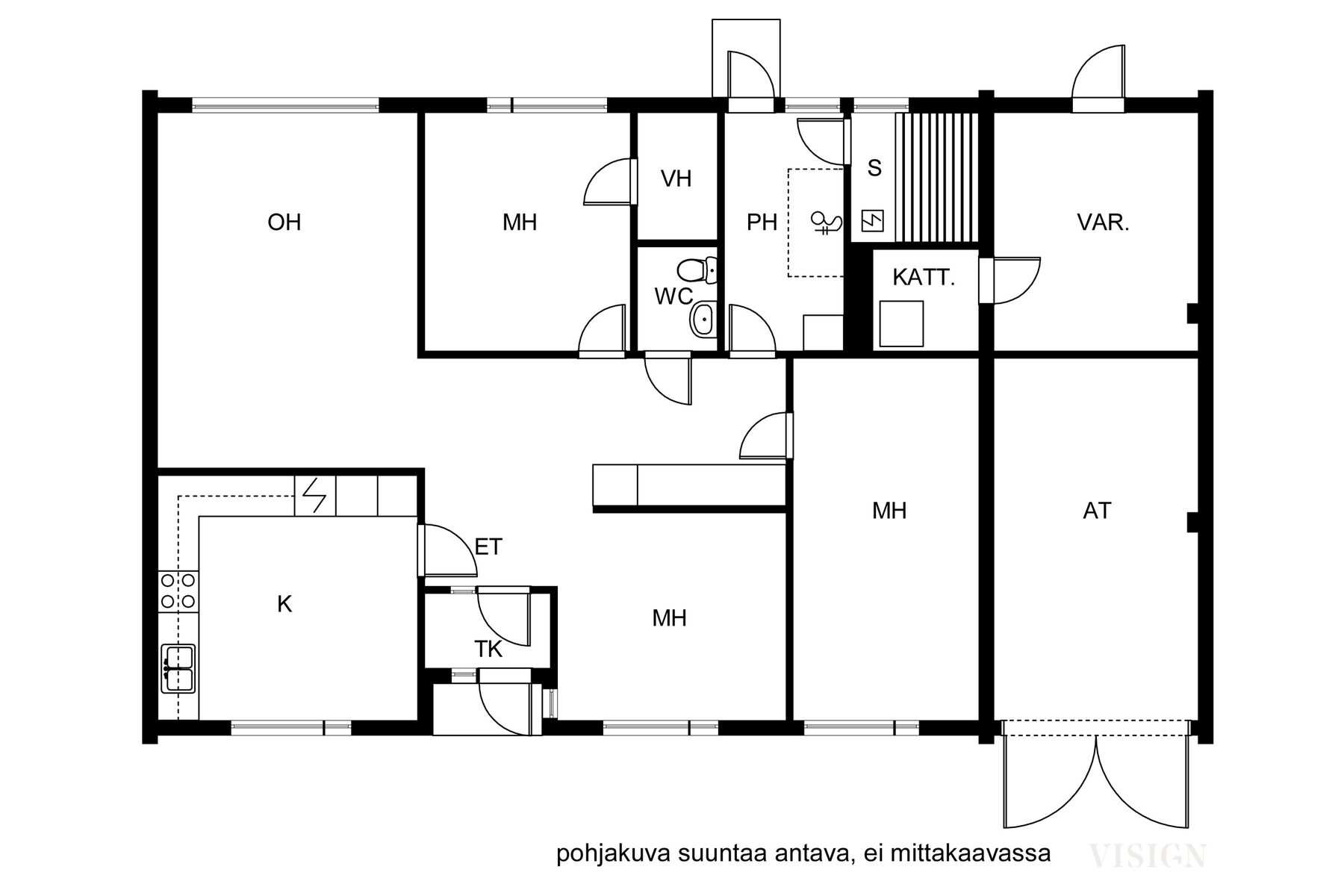 Tämä yksitasoinen koti käsittää olohuoneen, 3 makuuhuonetta, keittiön, puulämmitteisen saunan, kylpyhuoneen, erillisen wc:n sekä vaatehuoneen. Yksi makuuhuoneista on jälkikasvun lennettyä pesästä muutettu käytännölliseksi ruokailuhuoneeksi, mutta palautettavissa helposti alkuperäiseen käyttötarkoitukseensa. Asuinrakennuksen yhteydessä on alun perin autokatokseksi rakennettu autotalli, varasto sekä tekniset tilat.