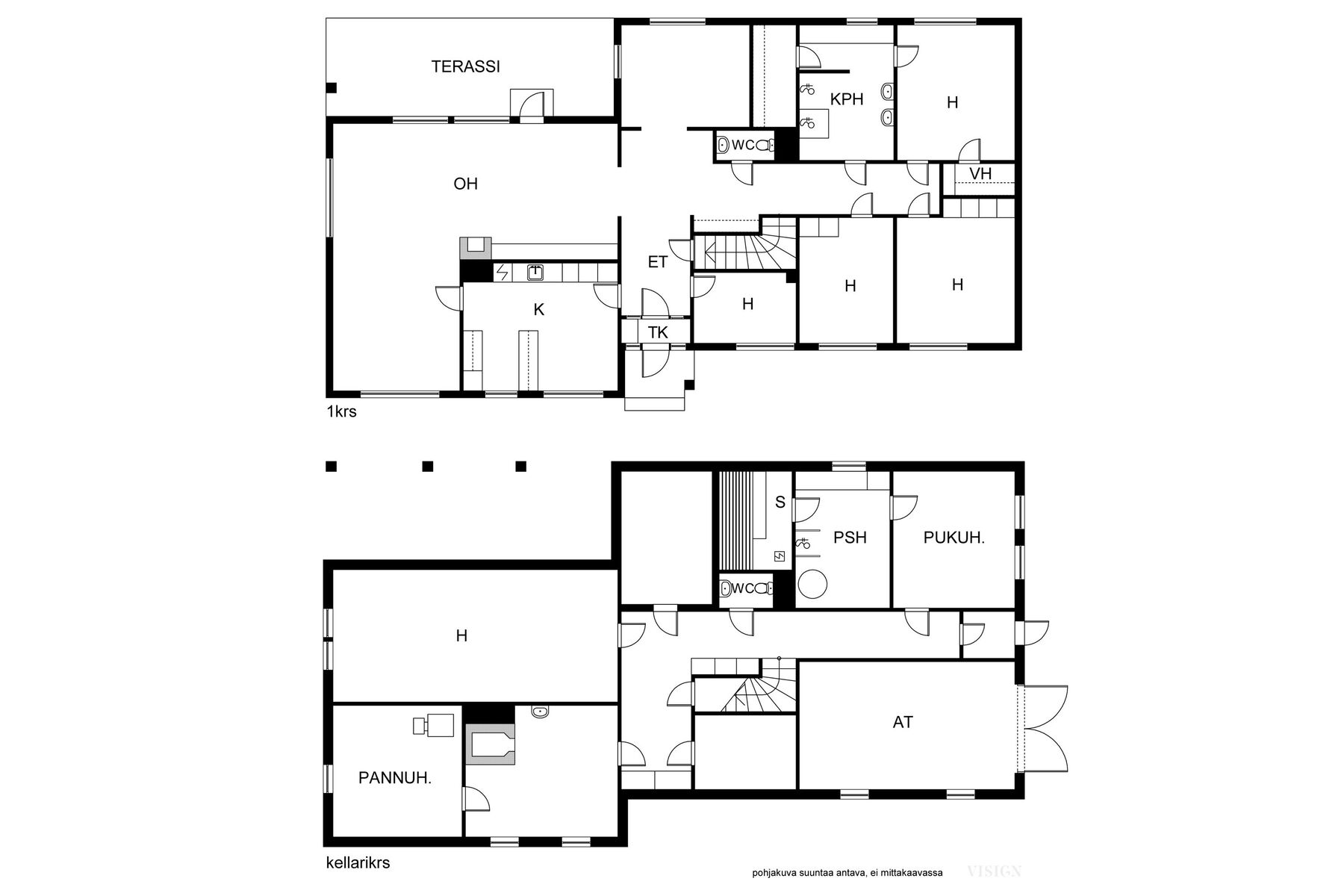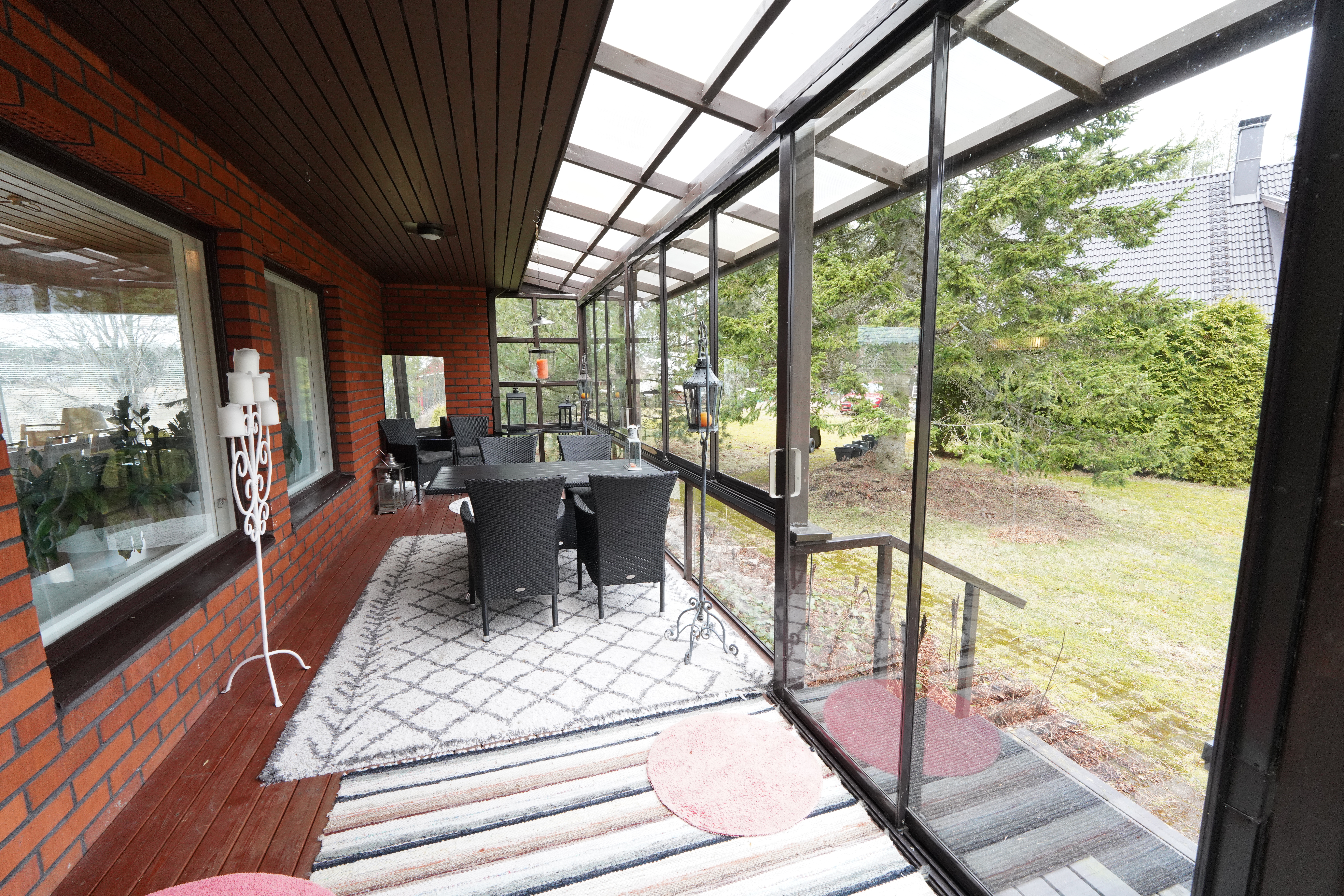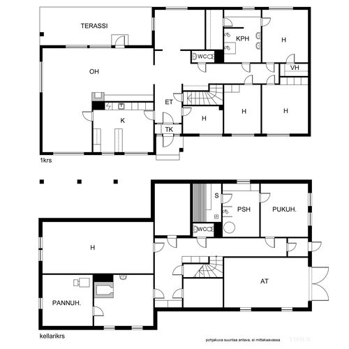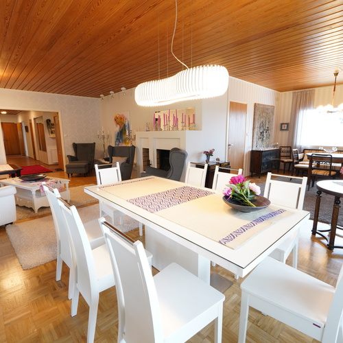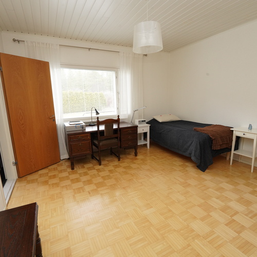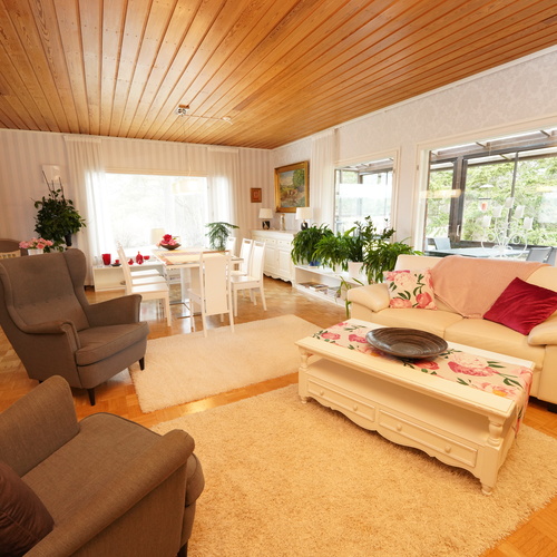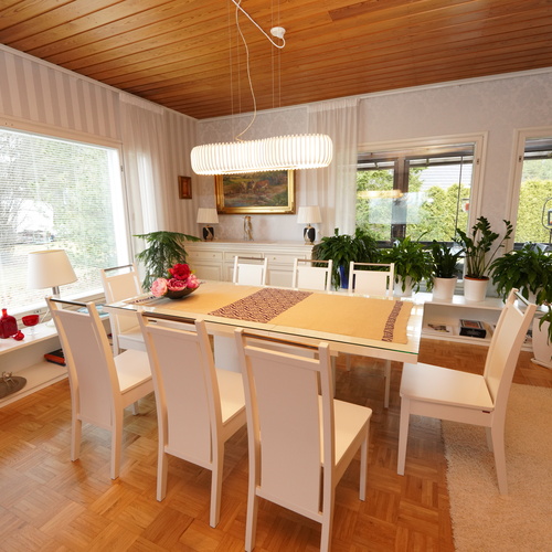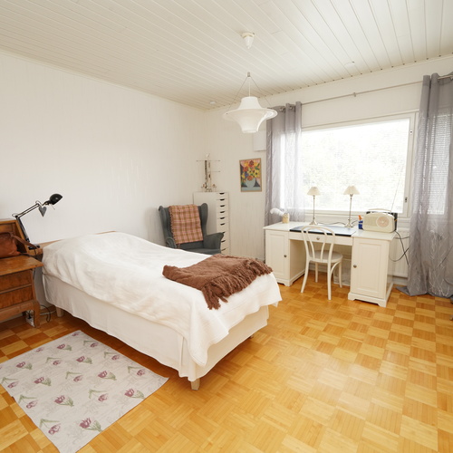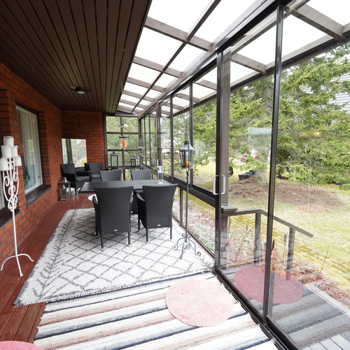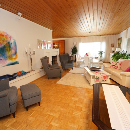 Tämä kaksikerroksinen koti täyttää suurenkin tilantarpeen. Viiden makuuhuoneen lisäksi varsinaisessa asuinkerroksessa on avara olohuone ruokailutiloineen, kylpyhuone, vaatehuone, erillinen wc sekä iso, lasitettu terassi, jonne on käynti sekä olohuoneesta että takapihalta. Kellarikerroksen monipuoliset tilat täydentävät kokonaisuutta: Mm. sauna sekä sähkö- että puukiukaineen ja tilava kylpyhuone, työhuone, toinen keittiö leivinuuneineen, harrastetiloja, autotalli ja runsaasti säilytystilaa. Kellarista pääsee sujuvasti suoraan autotalliin ja takapihalle