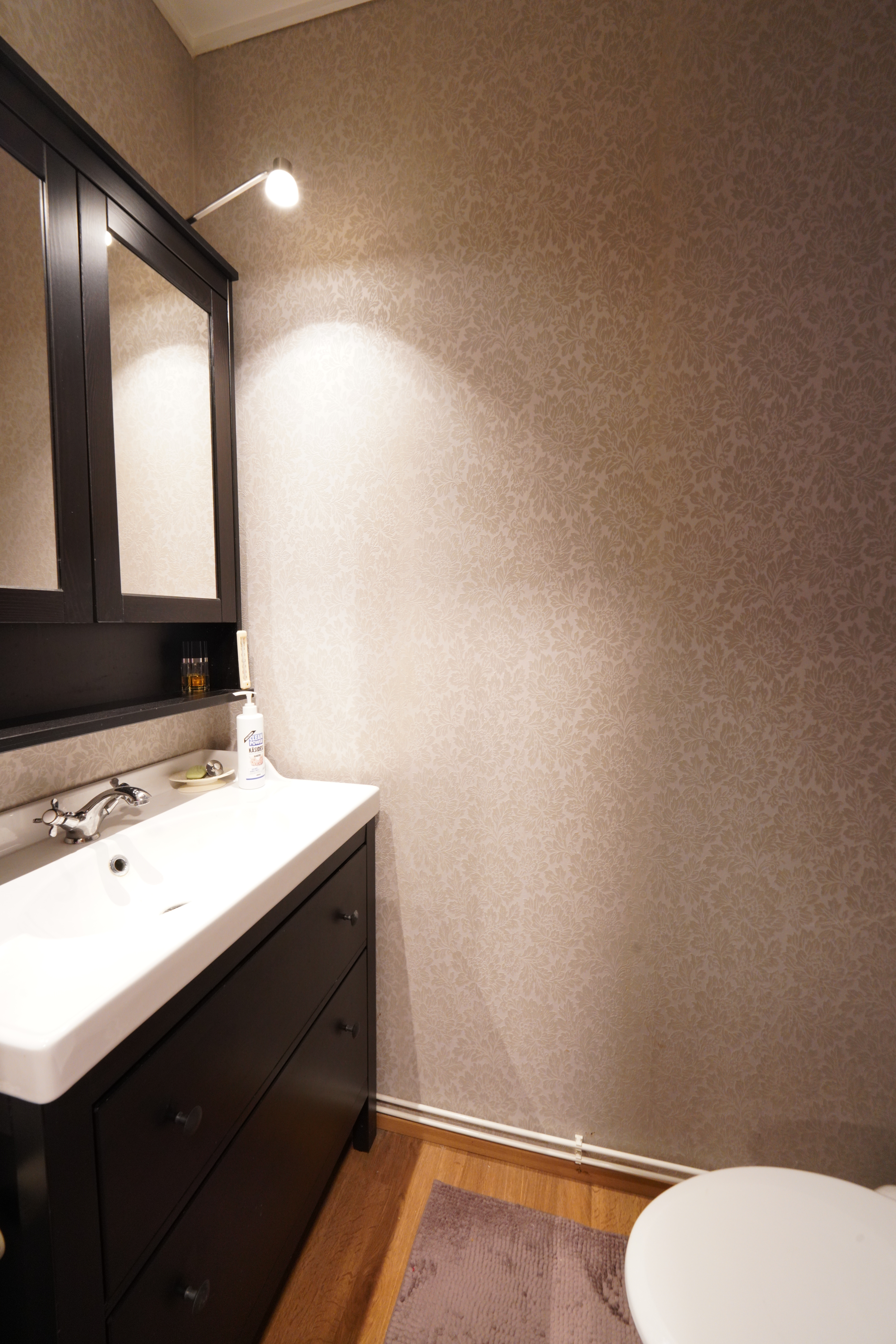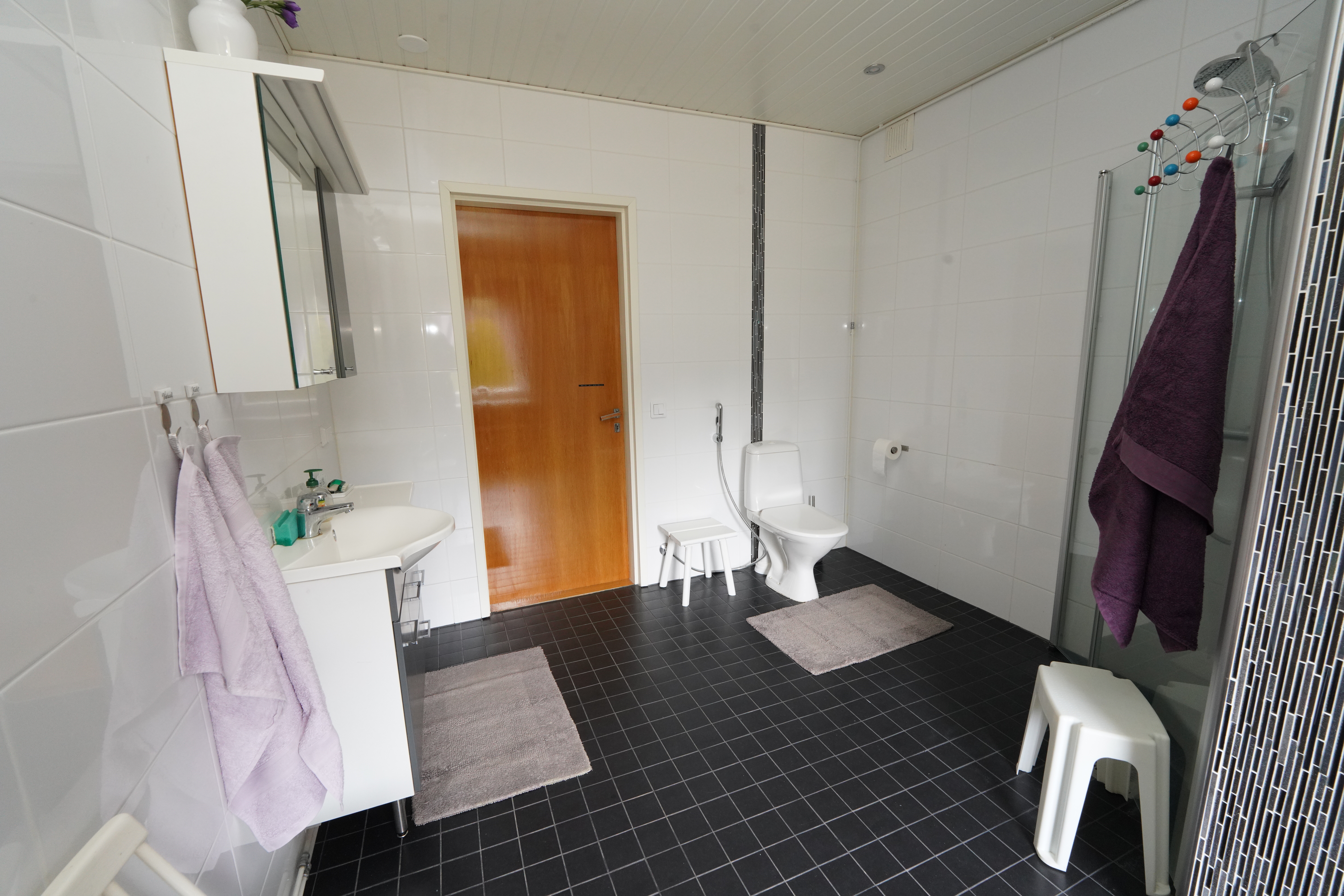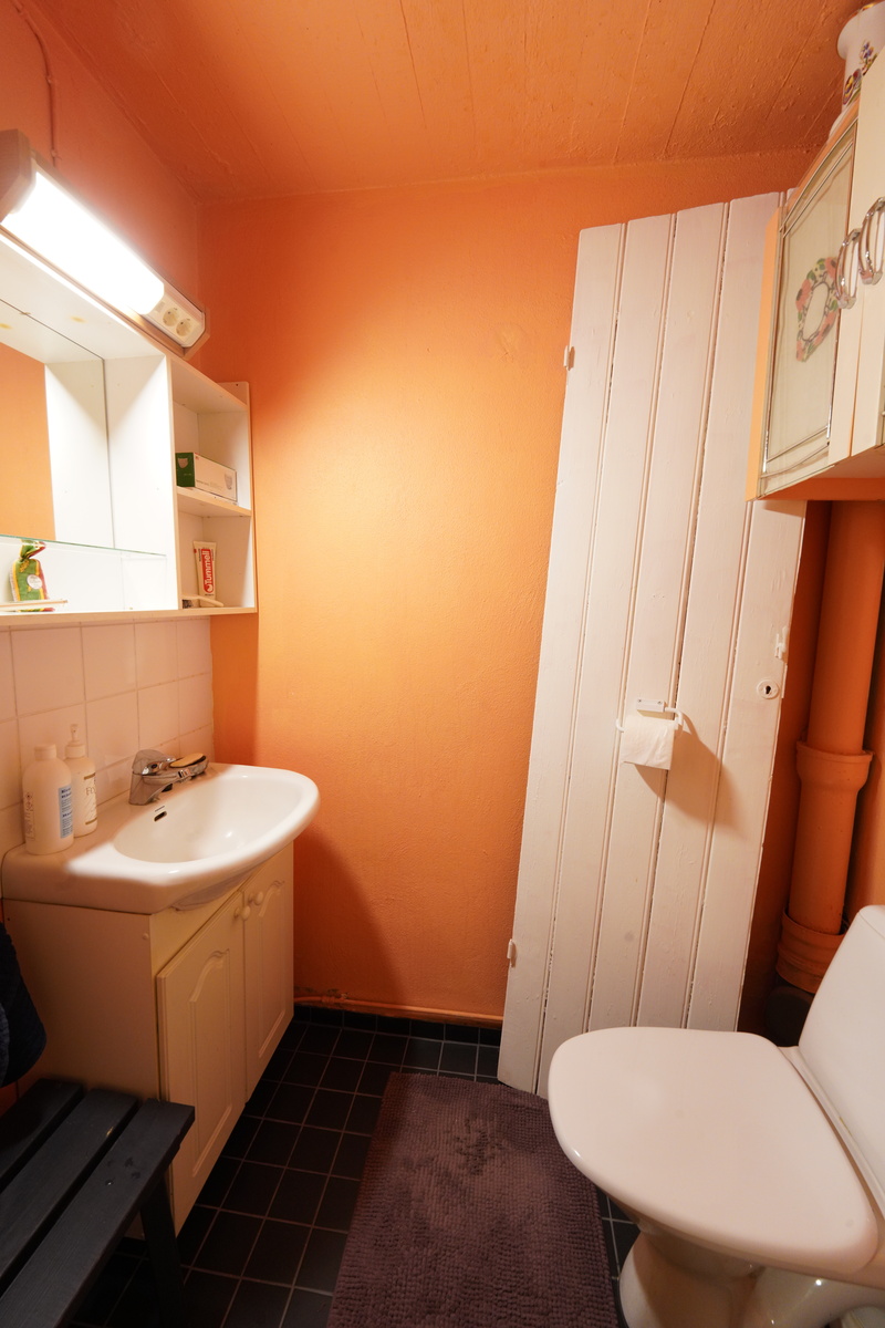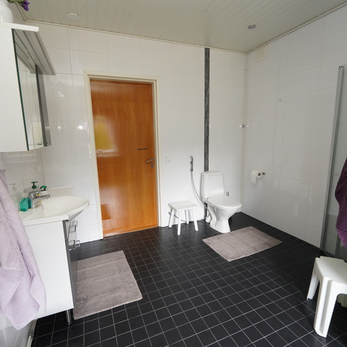 Varusteet: lattiaan asennettu WC, lattialämmitys, peilikaappi, allaskaappi