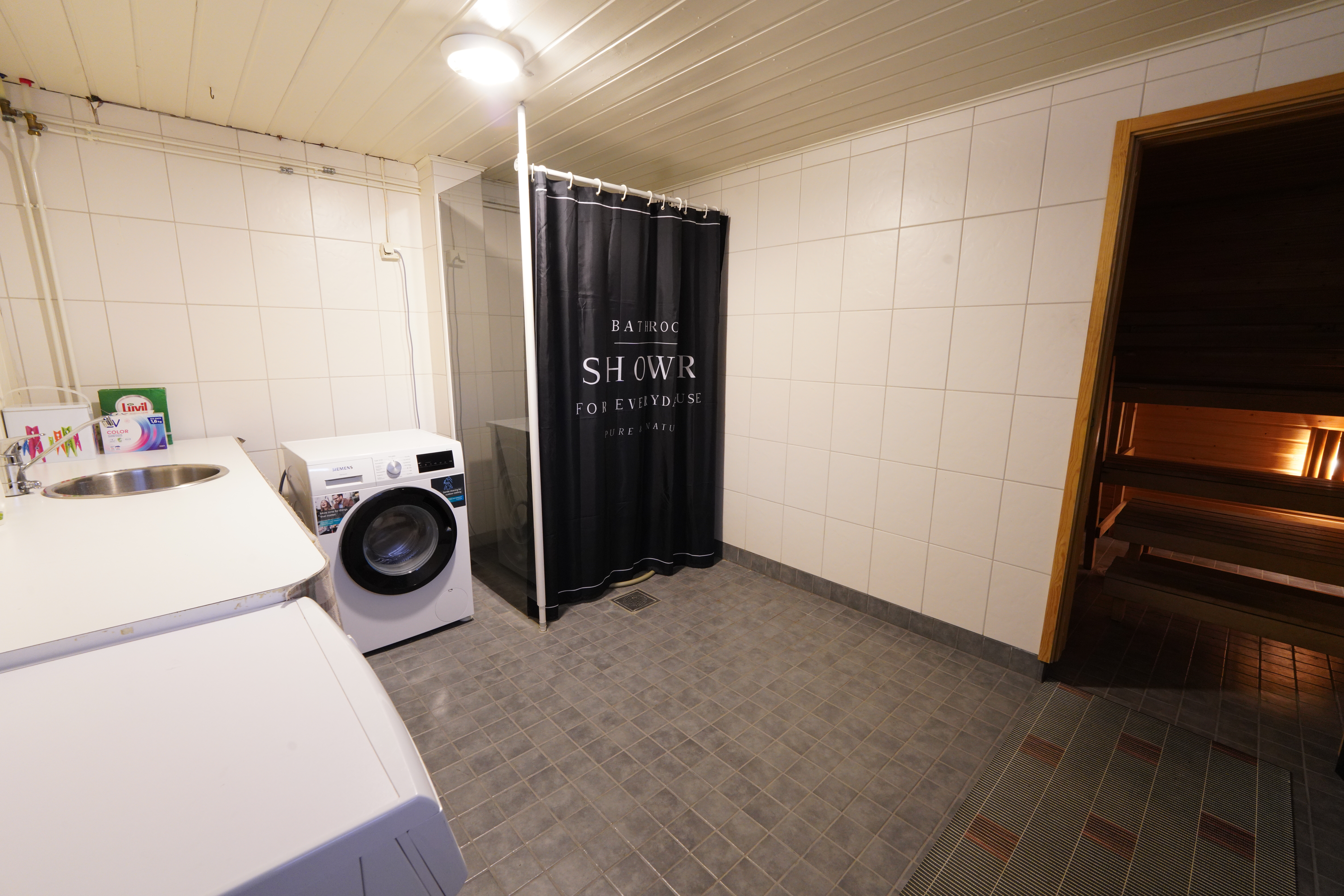 Suihku, suihkuseinä, pesukoneliitäntä, pesuallas, työtaso