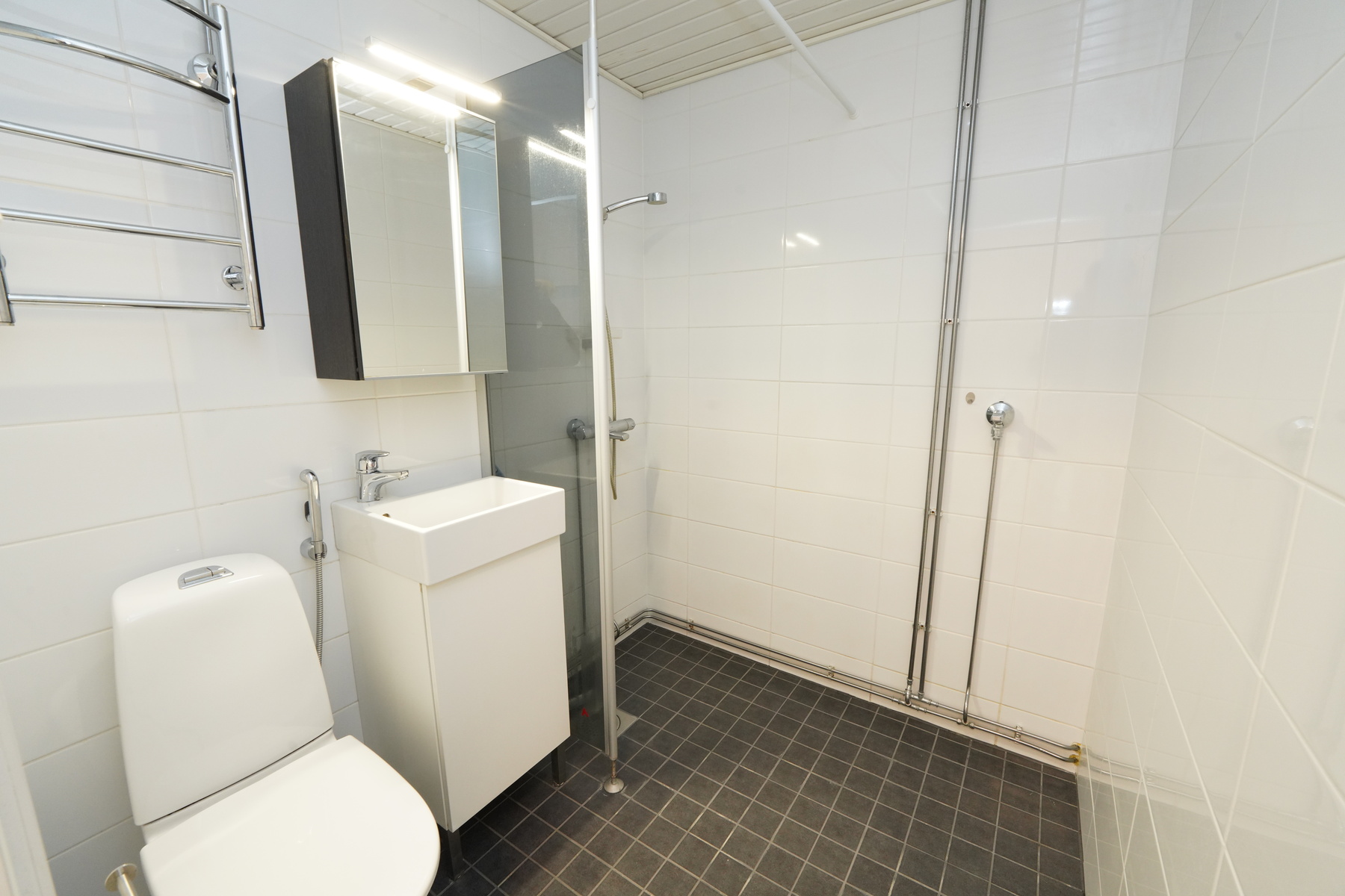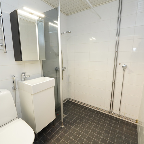 Varusteet: suihku, suihkuseinä, pesukoneliitäntä, lattialämmitys, peilikaappi