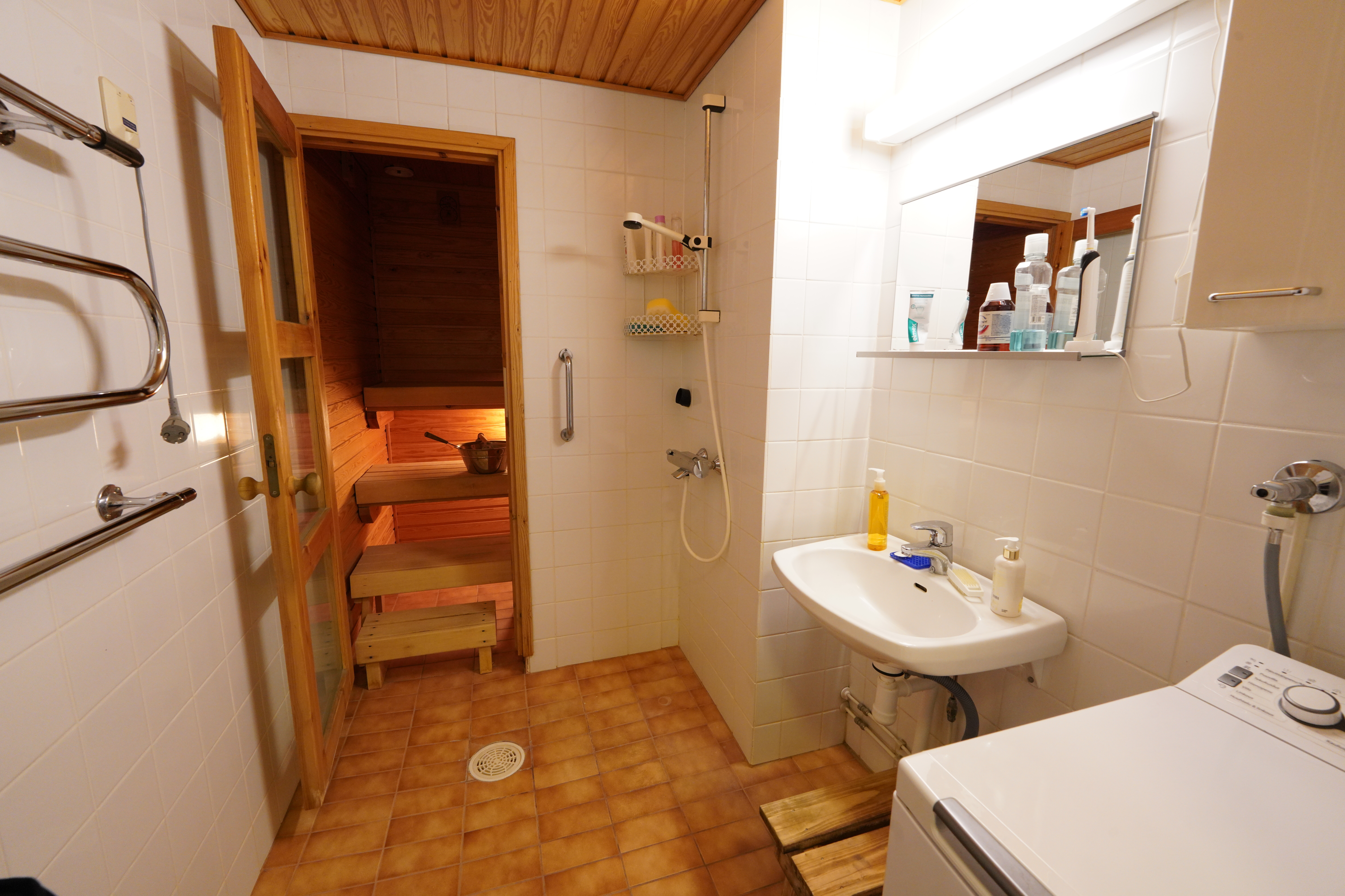 Varusteet: suihku, kiinteät valaisimet, pesukoneliitäntä, suihkukaappi