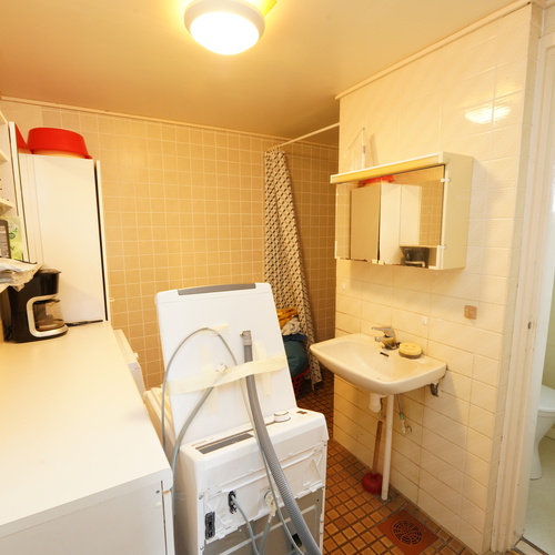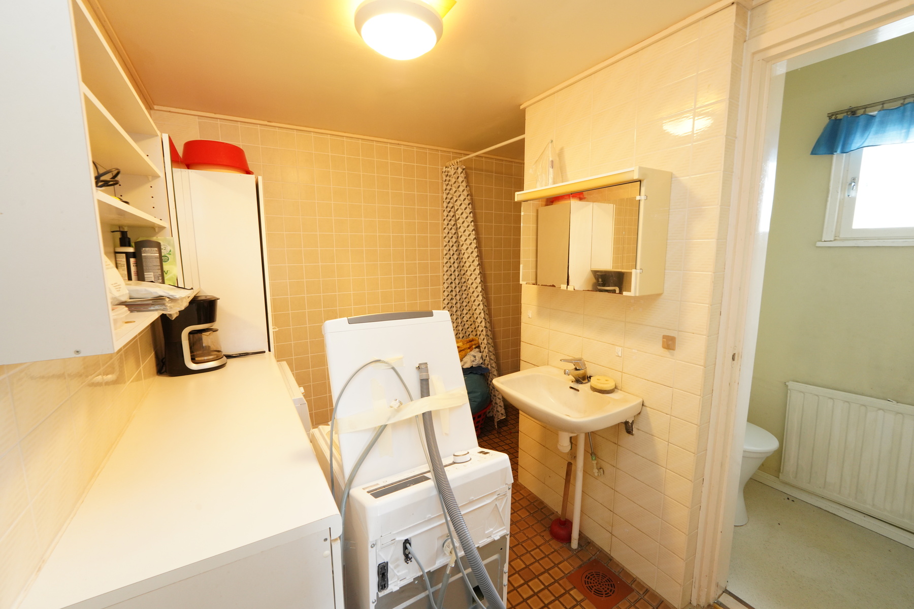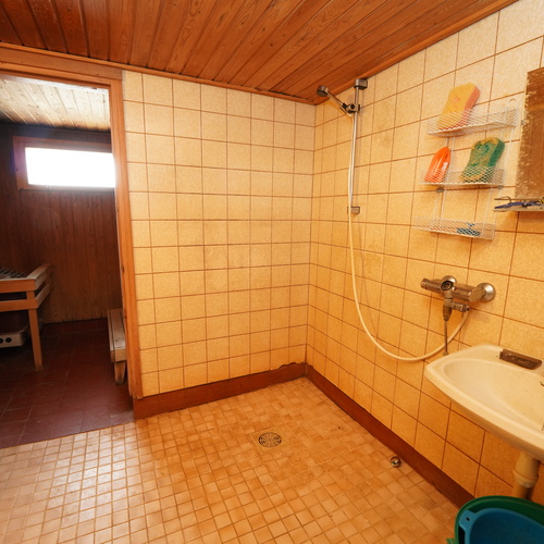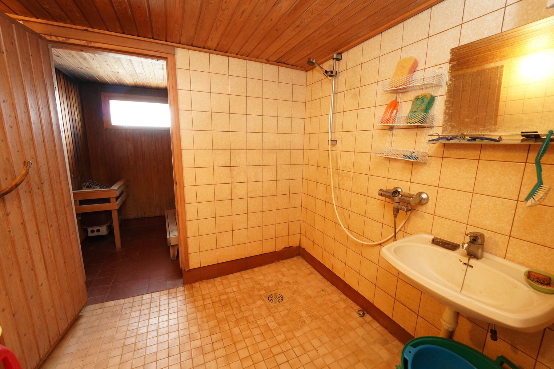 Asuinkerroksessa suihkutila, kellarin saunan yhteydessä kylpyhuone.