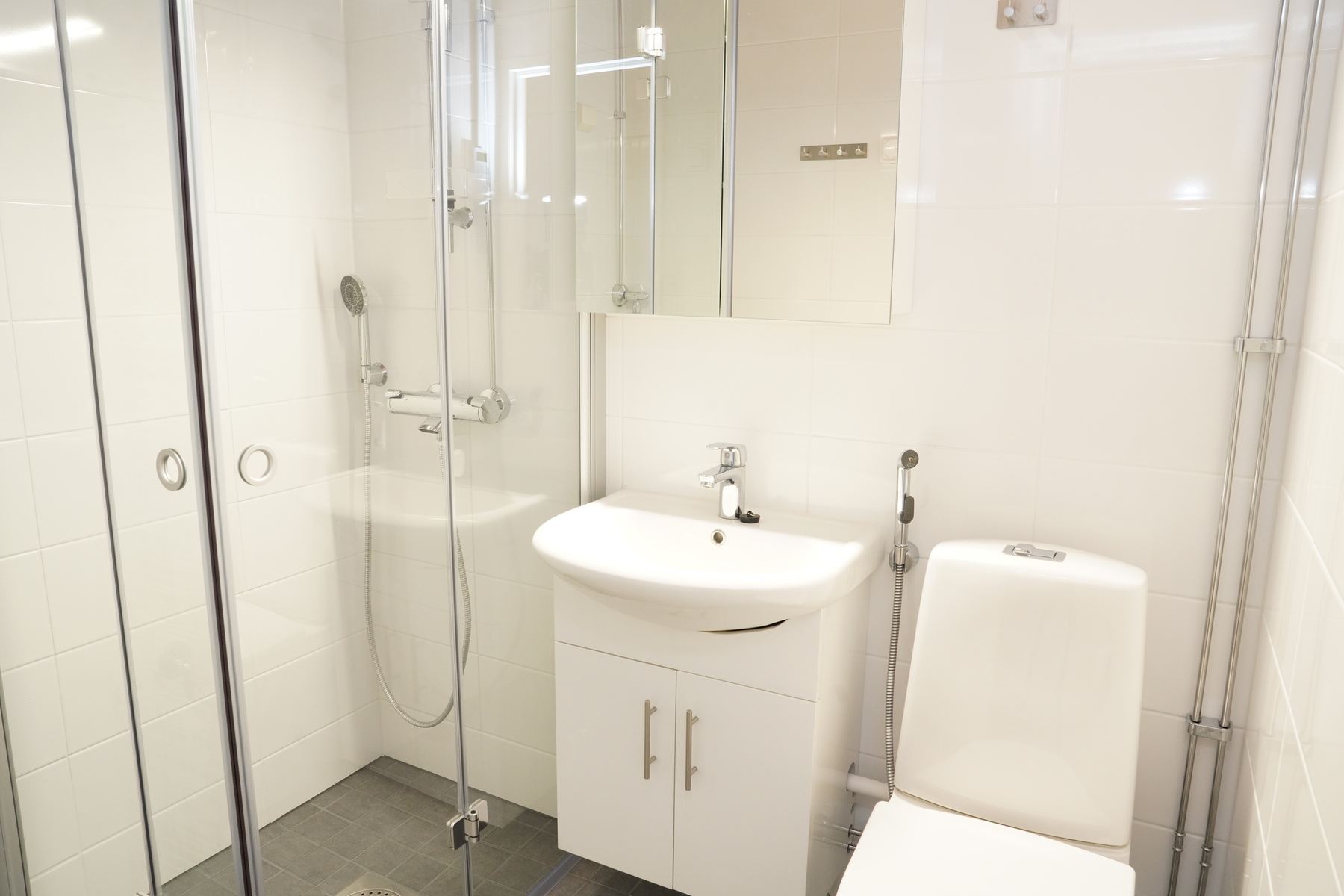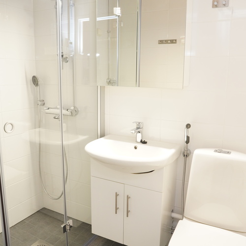 Varusteet: suihku, kiinteät valaisimet, lattialämmitys, suihkuseinä, pesukoneliitäntä, peilikaappi, allaskaappi