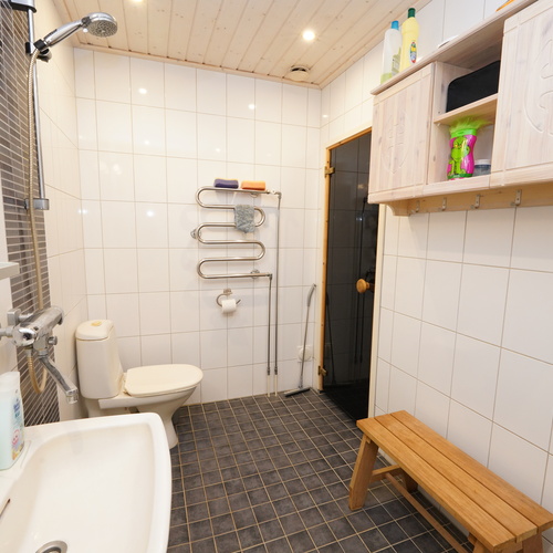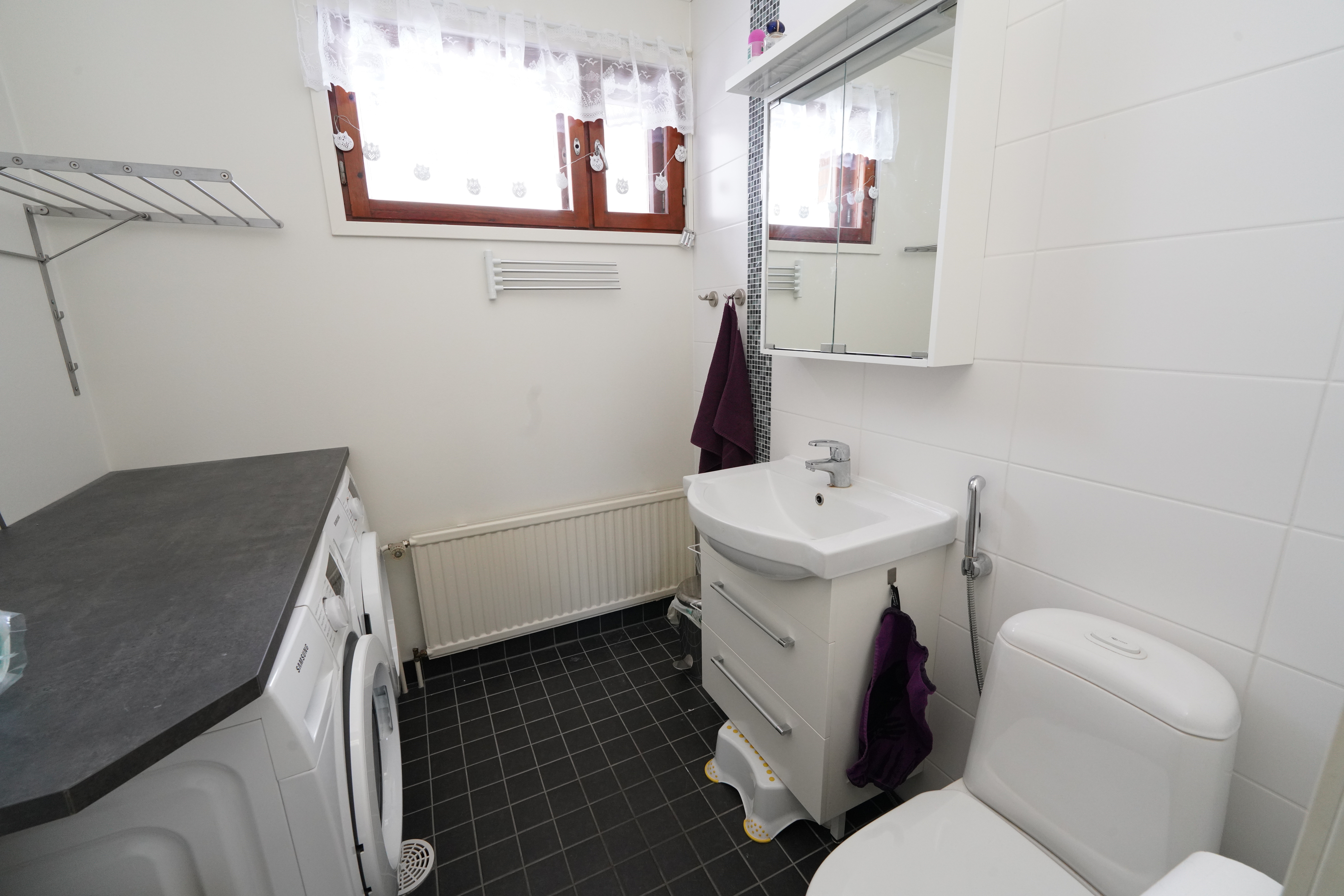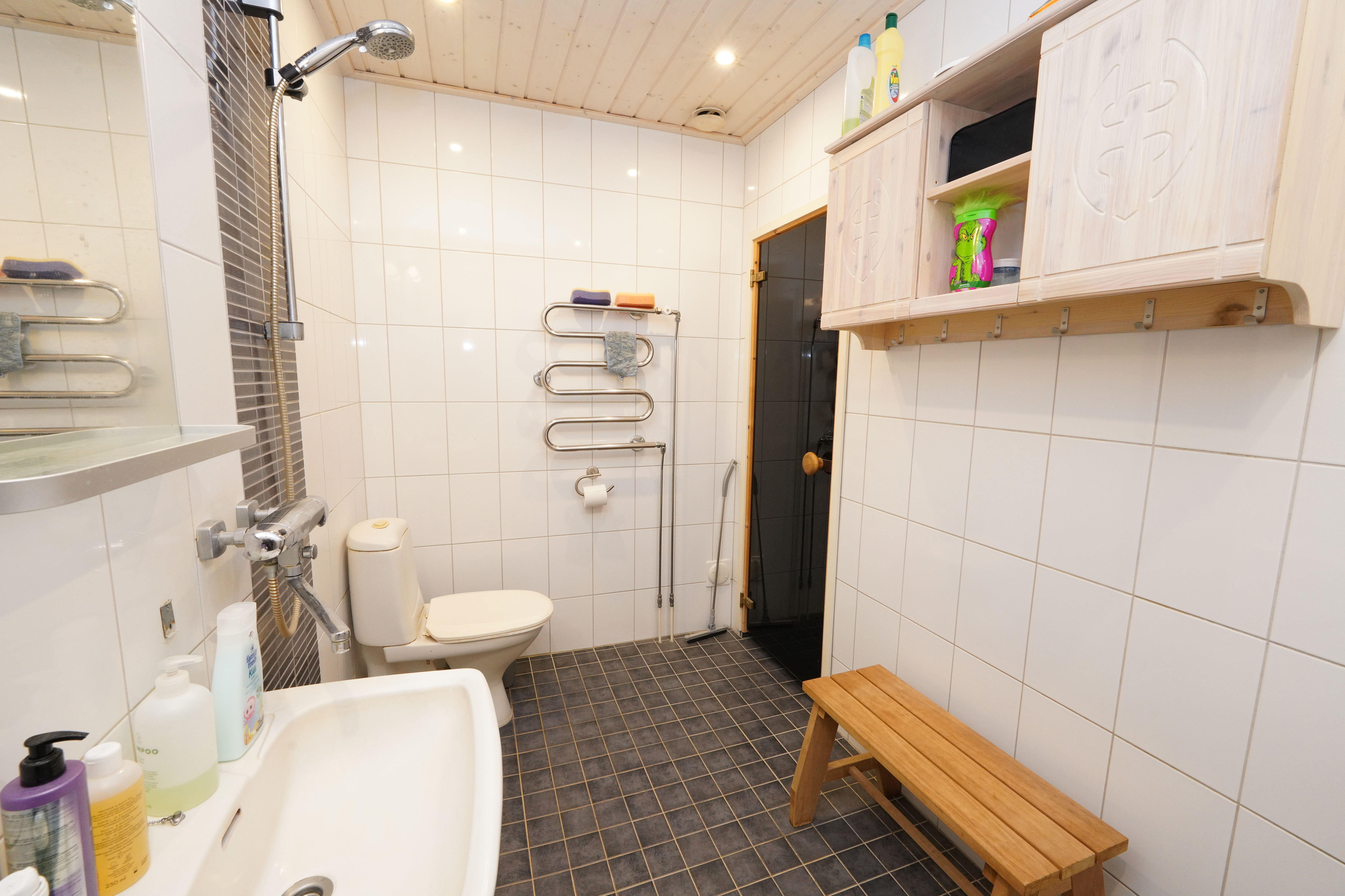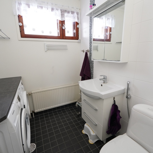 Varusteet: lattiaan asennettu WC, peilikaappi, pesukoneliitäntä