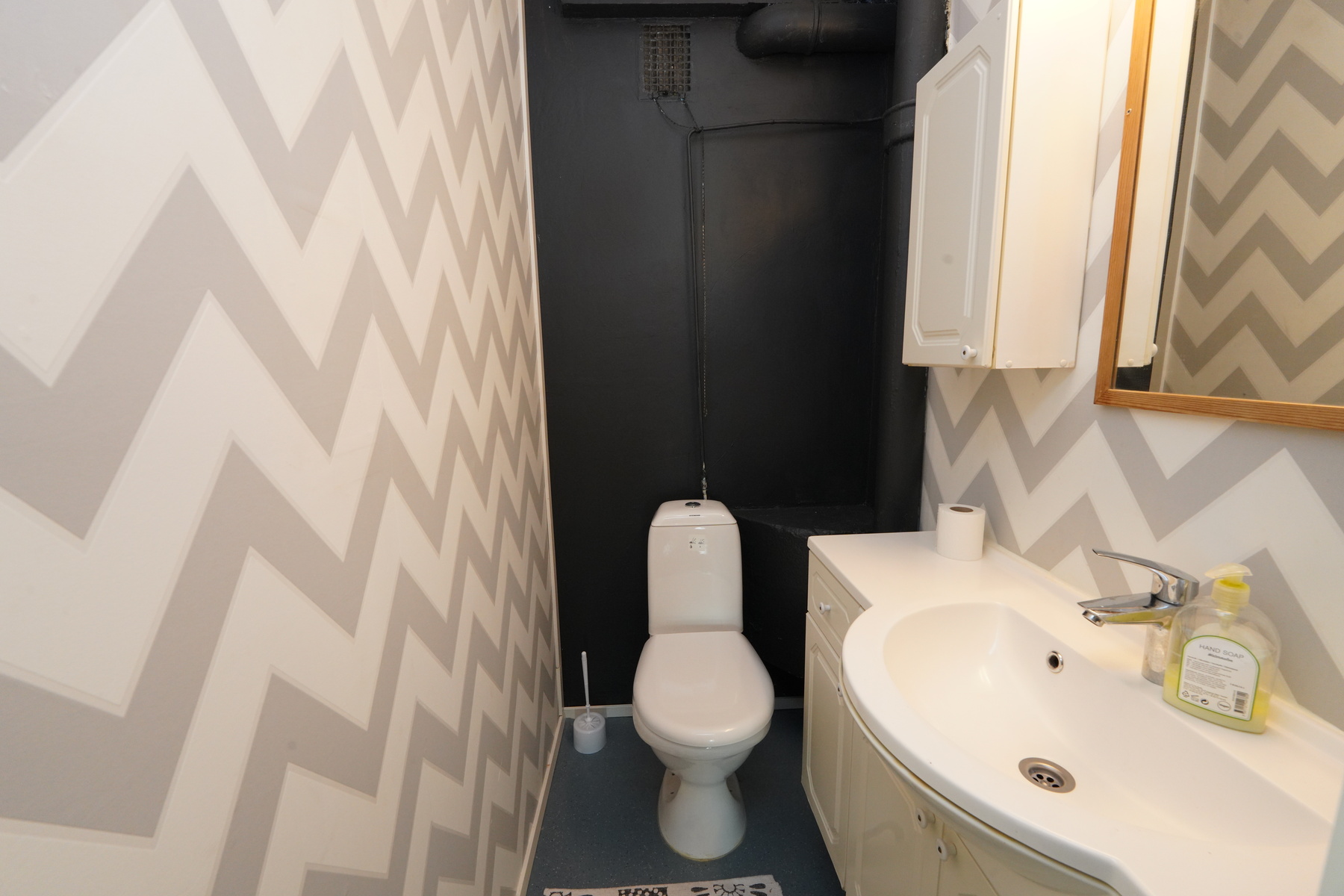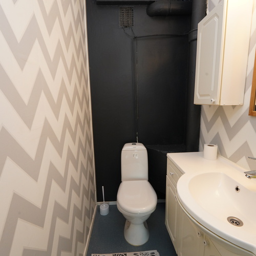 Varusteet: lattiaan asennettu WC, allaskaappi
