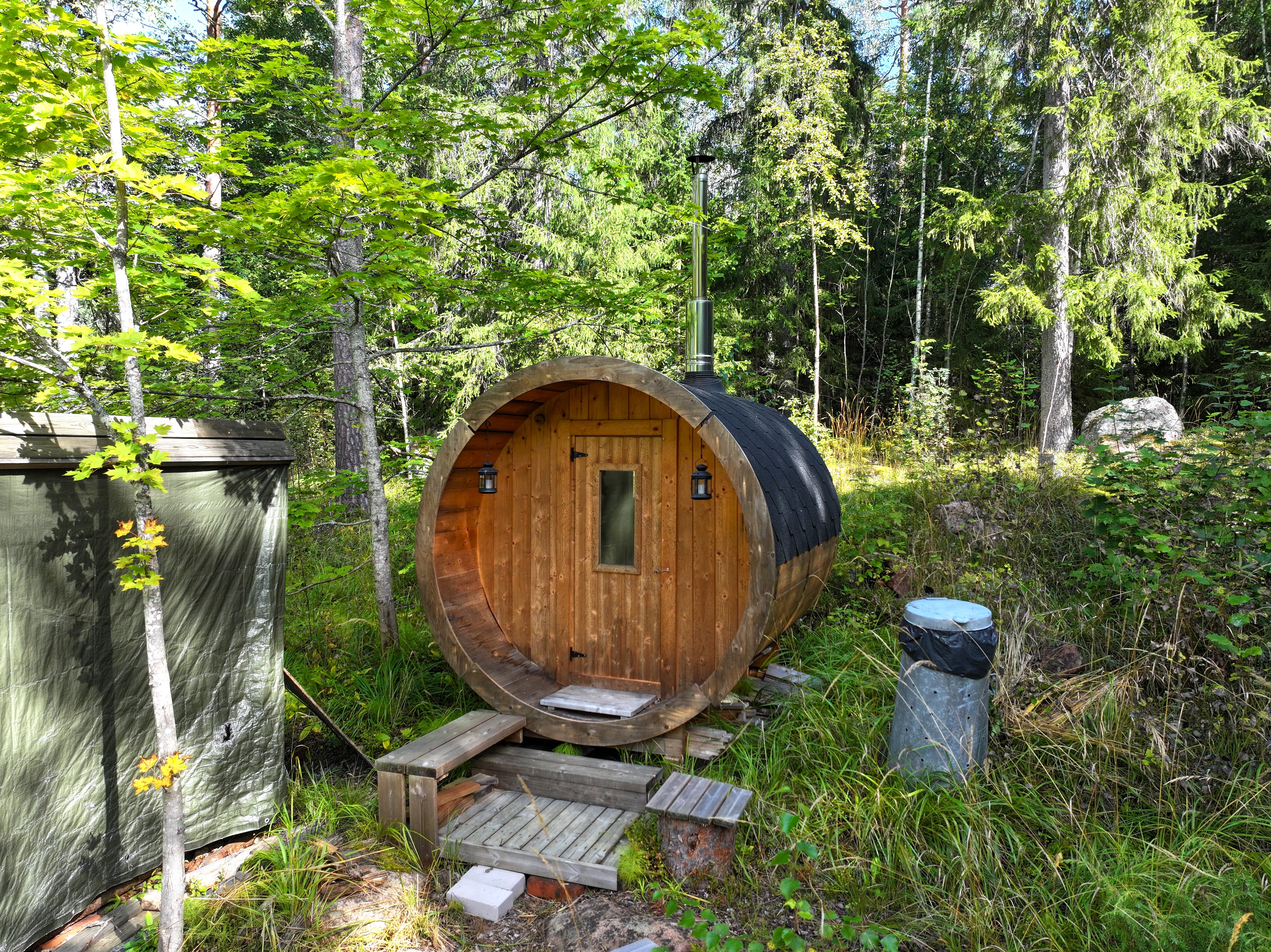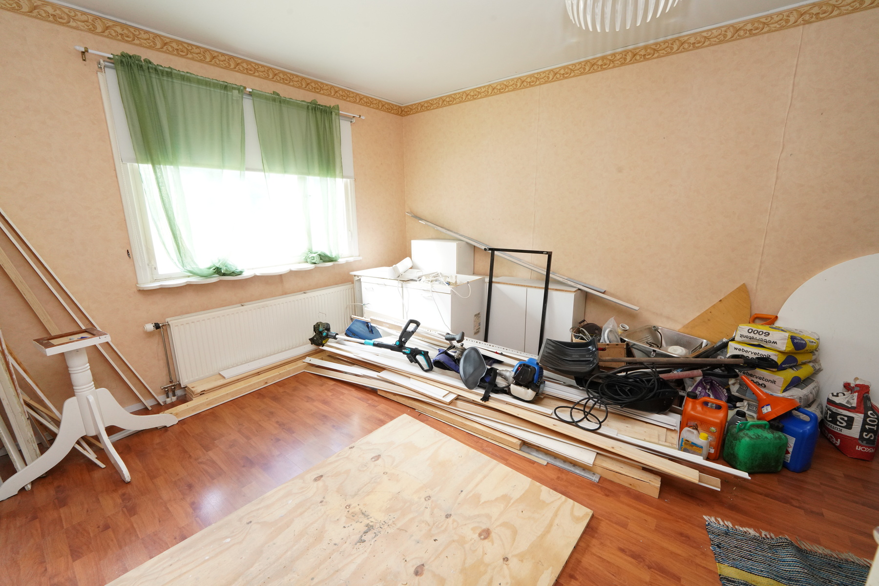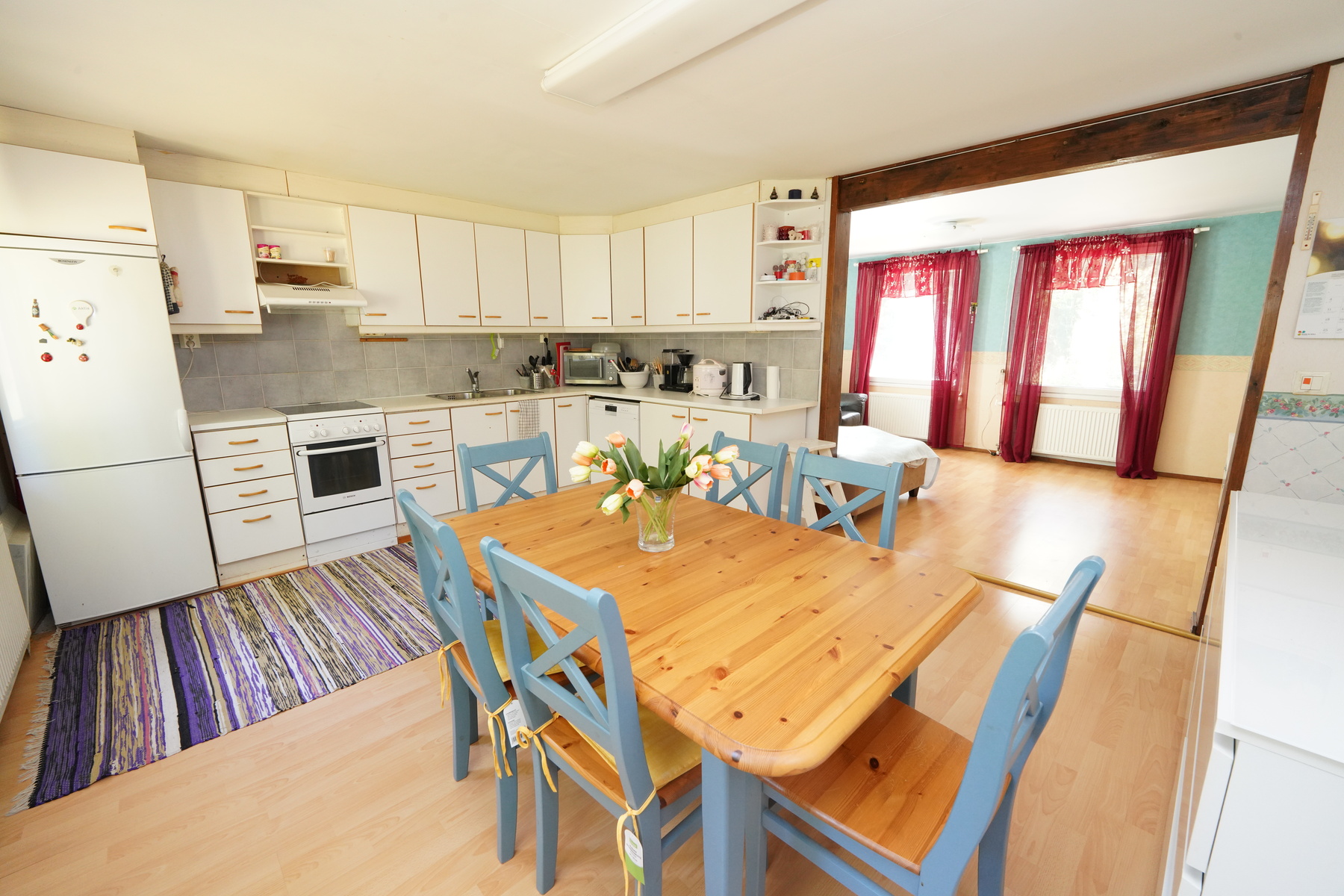Tämän kaksikerroksisen kodin alakerrasta löytyy keittiö, olohuone ja yksi makuuhuone sekä saunatilat, kun taas yläkerrassa on kaksi lisämakuuhuonetta. Sisätiloissa saneerauksen viimeistely on hieman kesken – esimerkiksi kodinhoitotila. Kahdesta vierekkäisestä kiinteistöstä muodostuvalla isolla tontilla on päärakennuksen lisäksi erillinen, uudehko tynnyrisauna sekä viihtyisä kota.