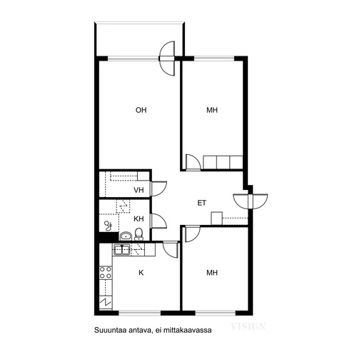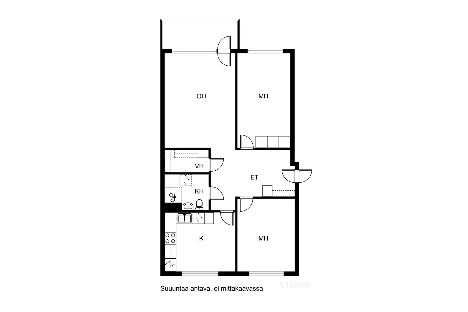 Asunto käsittää kolme huonetta sekä keittiön, ja sen pohjaratkaisu on suunniteltu perheen tarpeita ajatellen. Kaksi makuuhuonetta antavat tilaa perheenjäsenille, ja tilavahko vaatehuone takaa riittävän säilytystilan. Ylimmässä kerroksessa sijaitseva koti tarjoaa näkymät sekä itään että länteen.