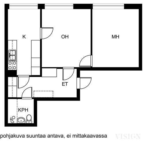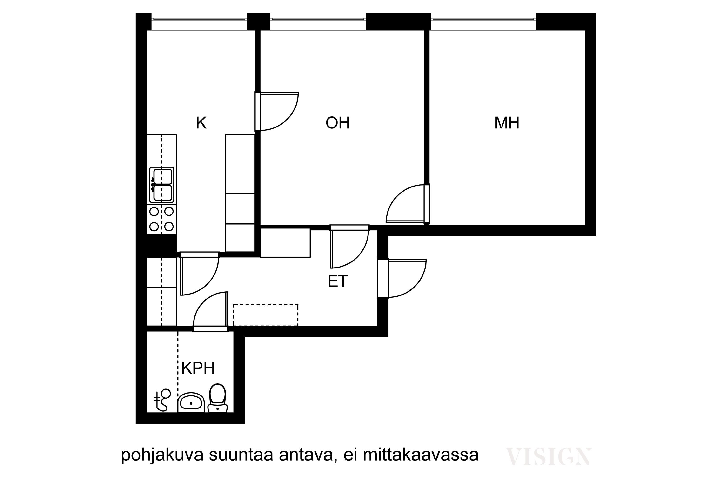 Asunto käsittää olohuoneen, makuuhuoneen, keittiön sekä kylpyhuoneen. Toimiva pohjaratkaisu hyödyntää tilan tehokkaasti, ja laminaattilattiat luovat yhtenäisen ilmeen koko kotiin. Keittiössä on valmiina kaikki tarvittavat kodinkoneet astianpesukoneesta jääkaappipakastimeen.