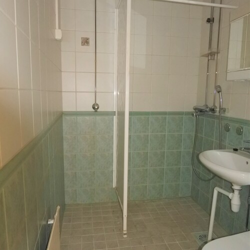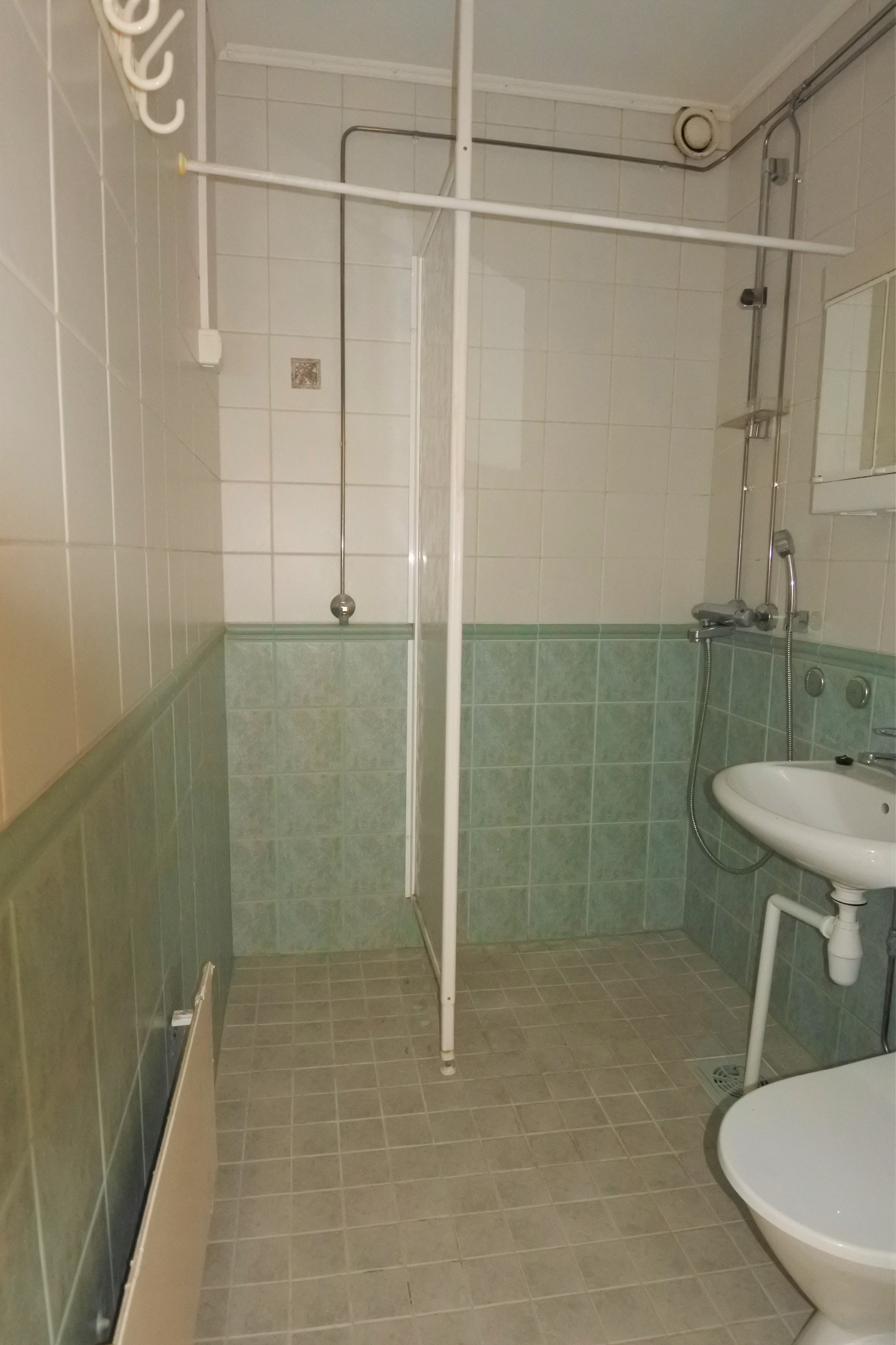Varusteet: suihku, suihkuseinä, pesukoneliitäntä, peilikaappi