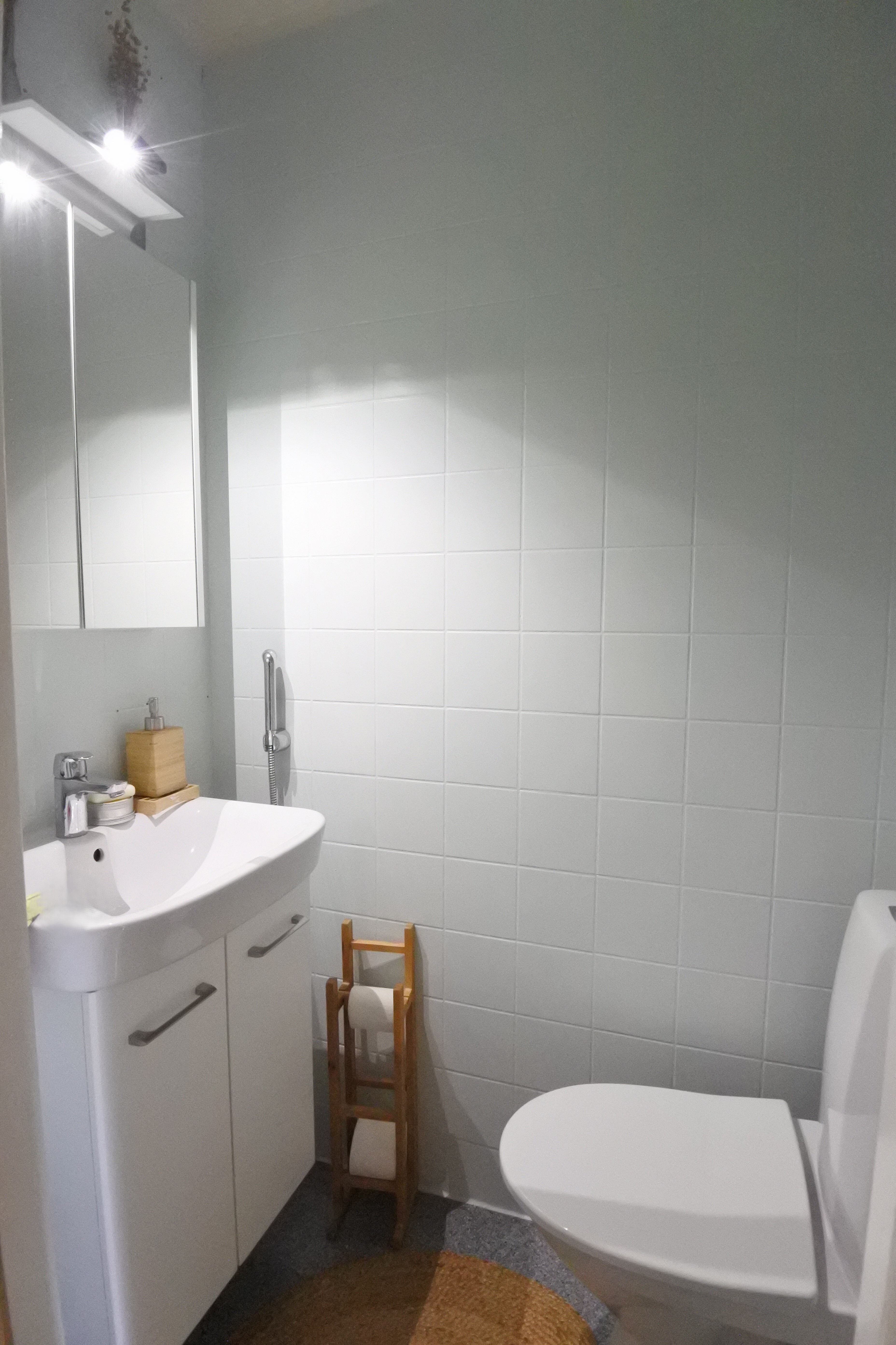 Varusteet: lattiaan asennettu WC, allaskaappi, peilikaappi
